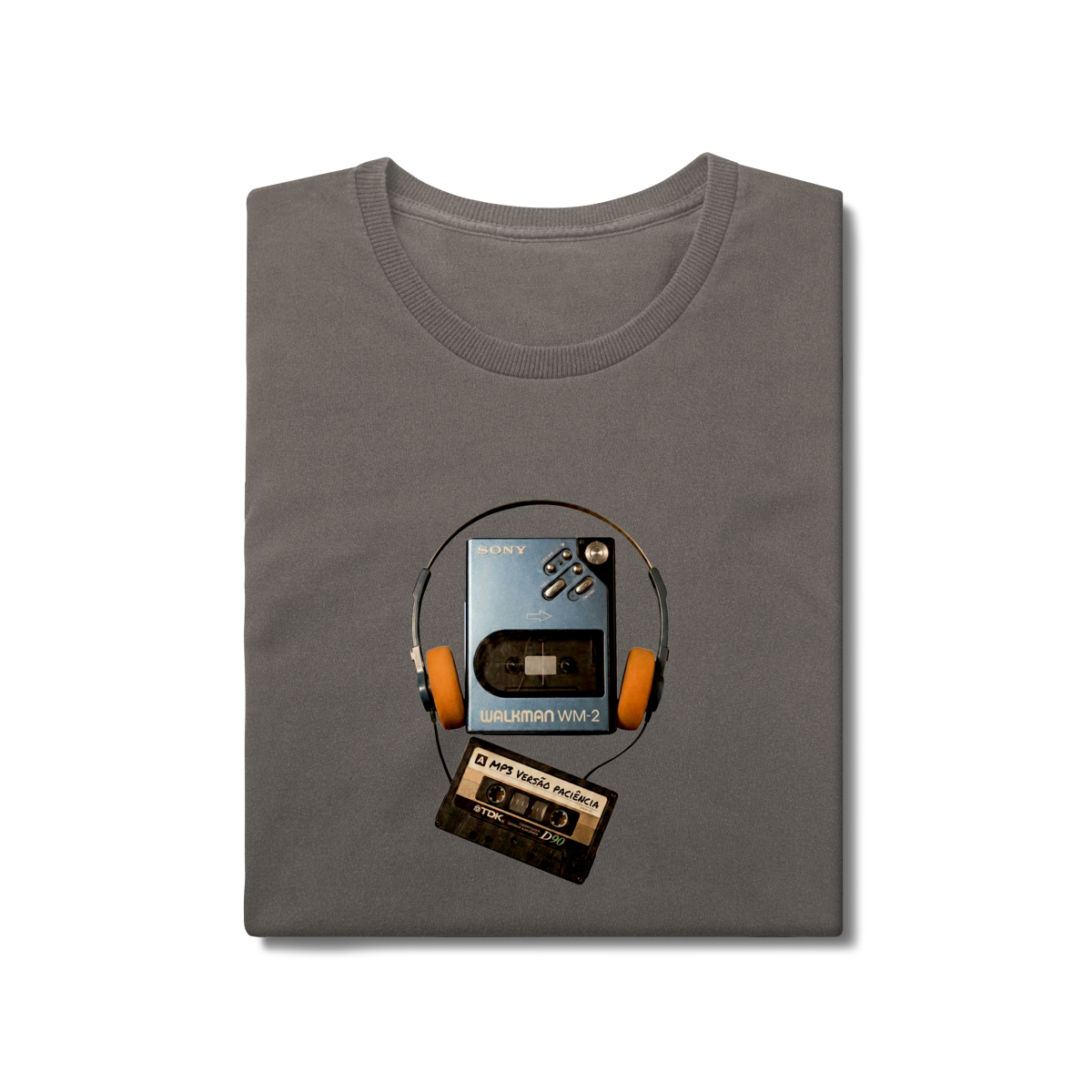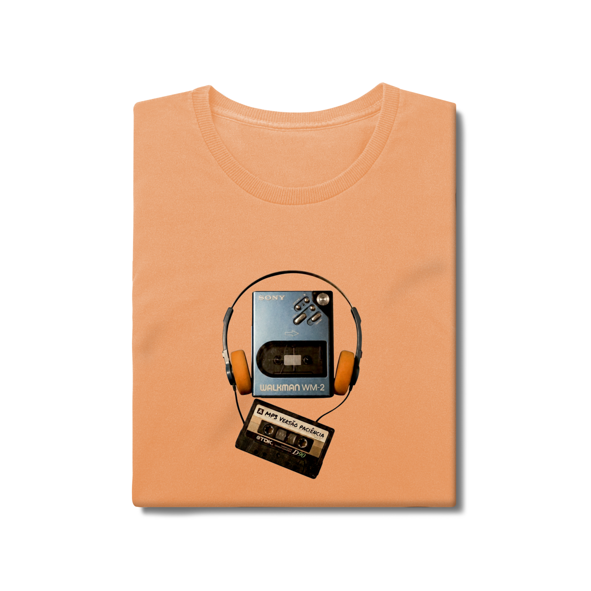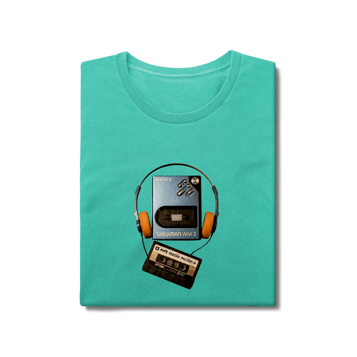 “MP3 – versão paciência” é o choque entre dois mundos: a pressa digital e a força de quem sabia esperar. A fita no walkman lembra que nem tudo era instantâneo — e exatamente por isso tinha valor. Esta estampa é um manifesto silencioso contra o imediatismo e a favor da presença real. Vista resiliência. Vista Presença Offline.