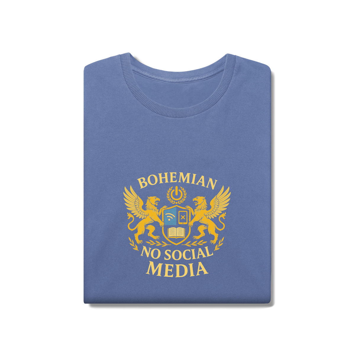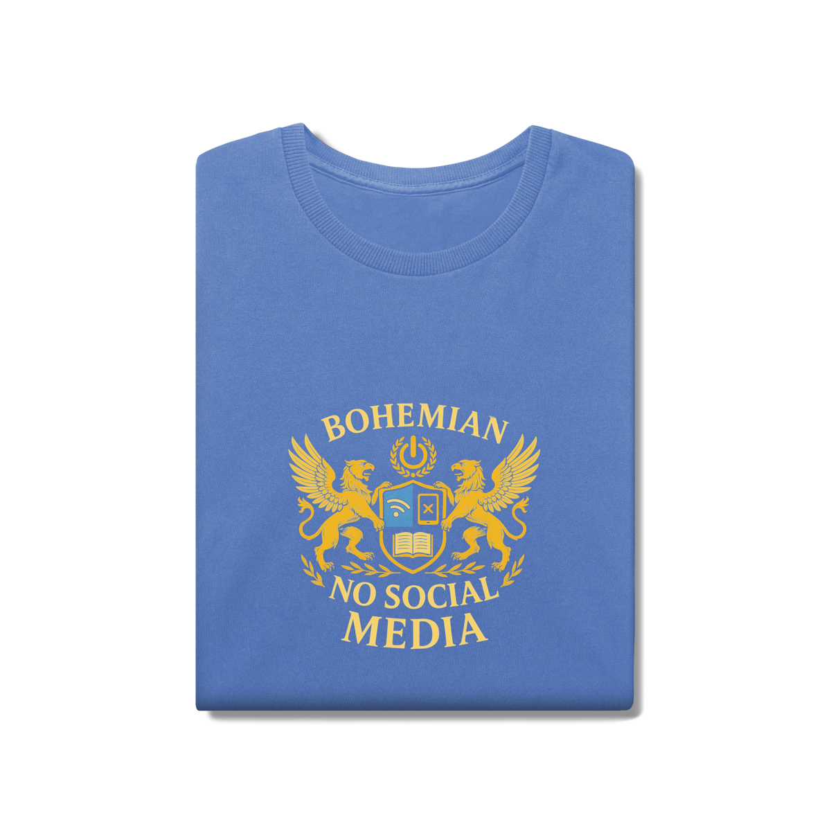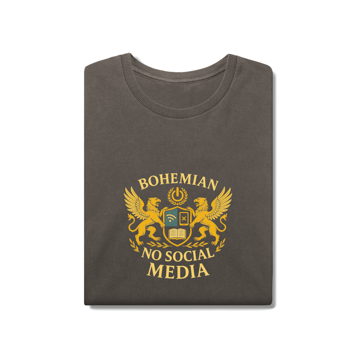 BOEHMIA NO SOCIAL MEDIA ressignifica um ícone da cultura pop para afirmar um modo de viver mais autêntico, longe da performance e da necessidade de plateia. Em um mundo que exige exposição constante, esta estampa celebra a liberdade de existir sem se mostrar, sem competir por atenção e sem viver para as redes sociais. Uma peça para quem escolhe presença real em vez de espetáculo.