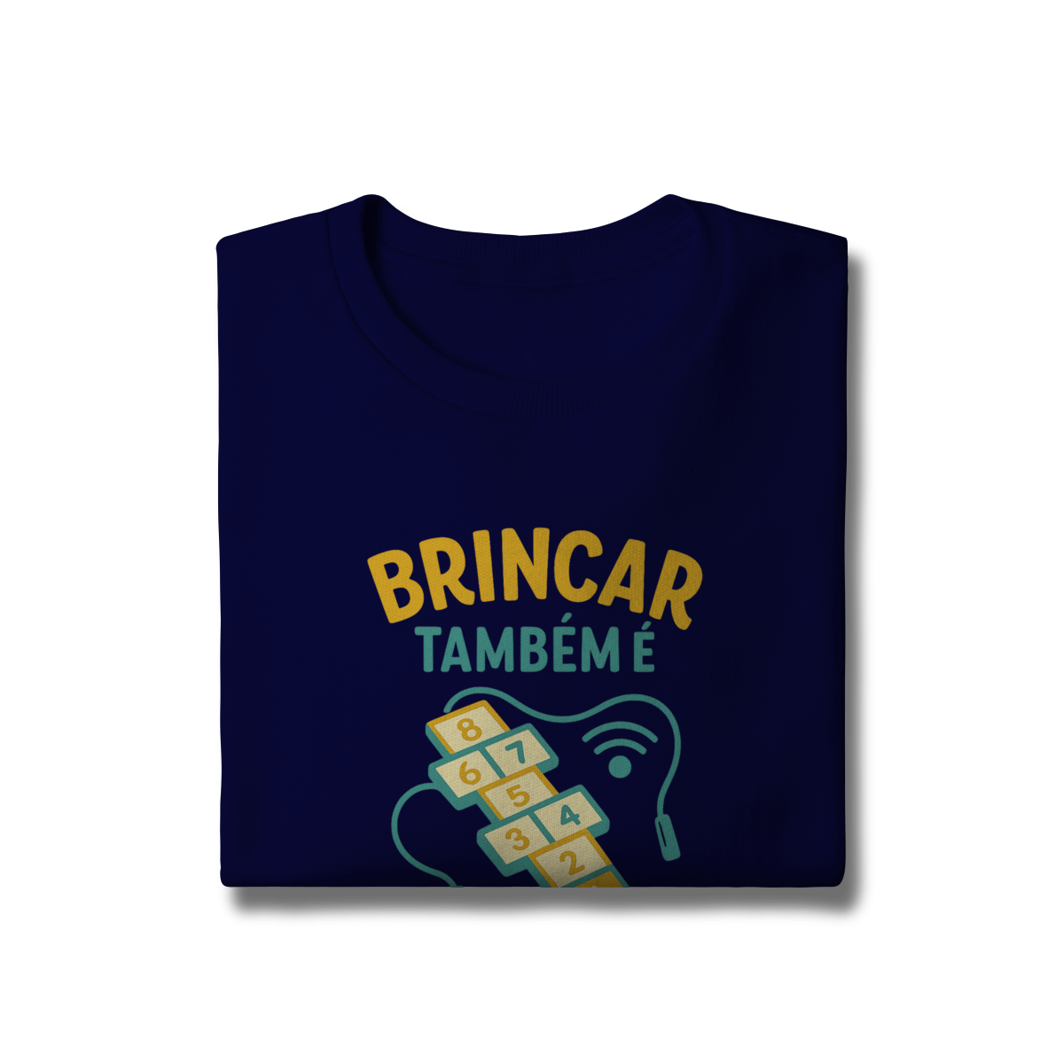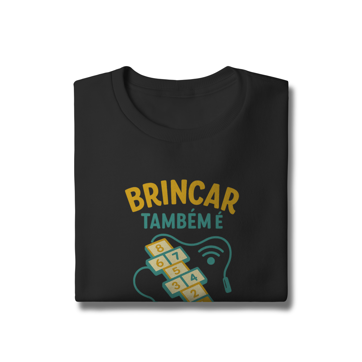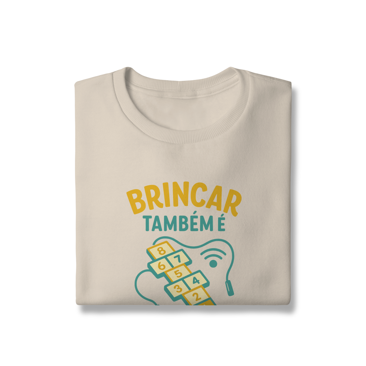 BRINCAR TAMBÉM É SÉRIO reconhece o crescimento como um exercício que exige reduzir a exposição constante aos estímulos eletrônicos. A estampa valoriza o brincar como espaço de presença, imaginação e desenvolvimento real. Uma peça que lembra que amadurecer também passa por saber quando se desconectar.