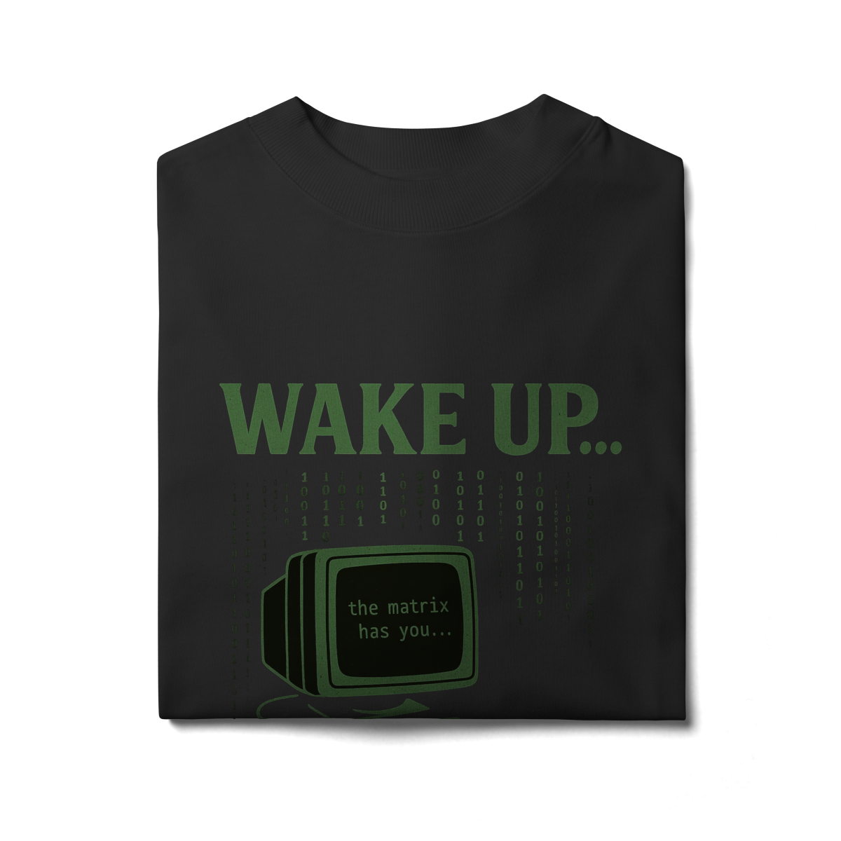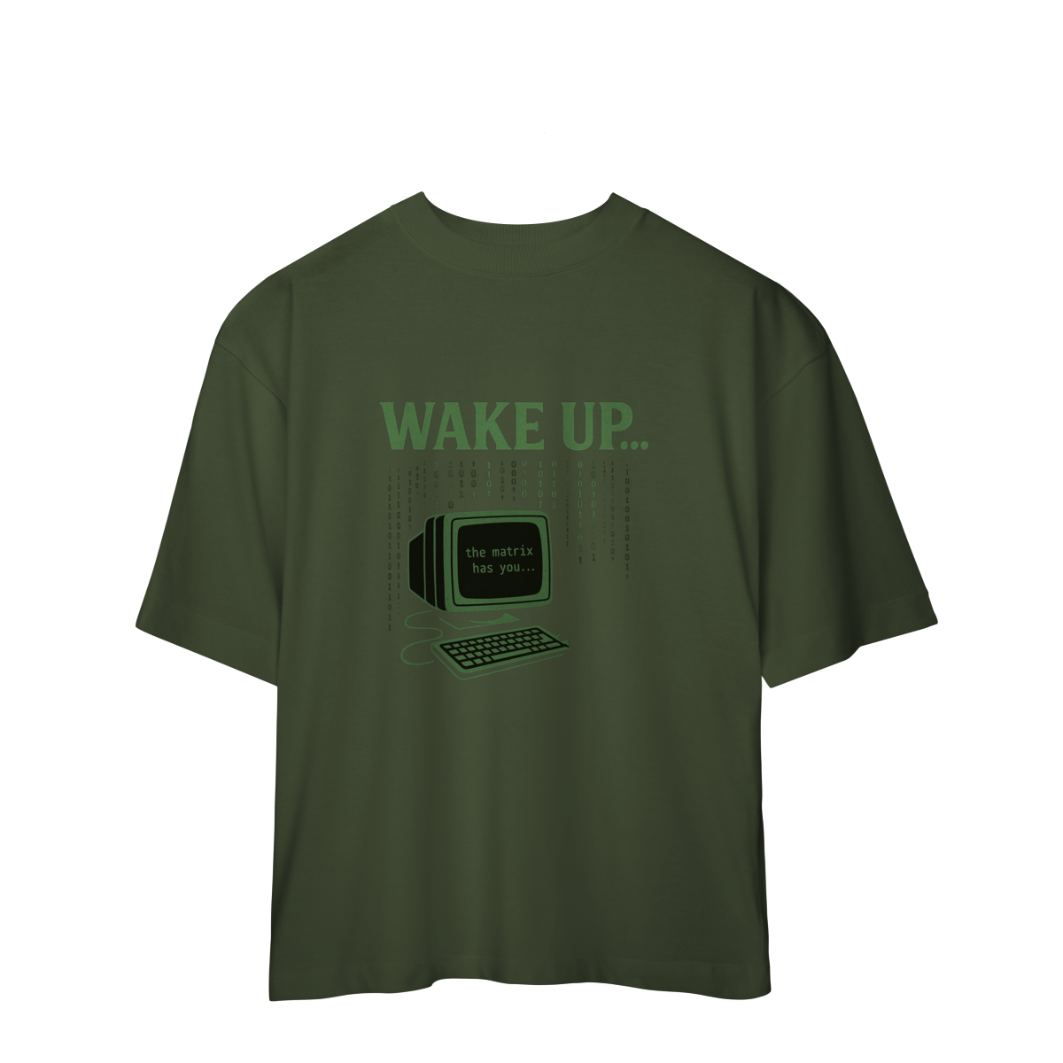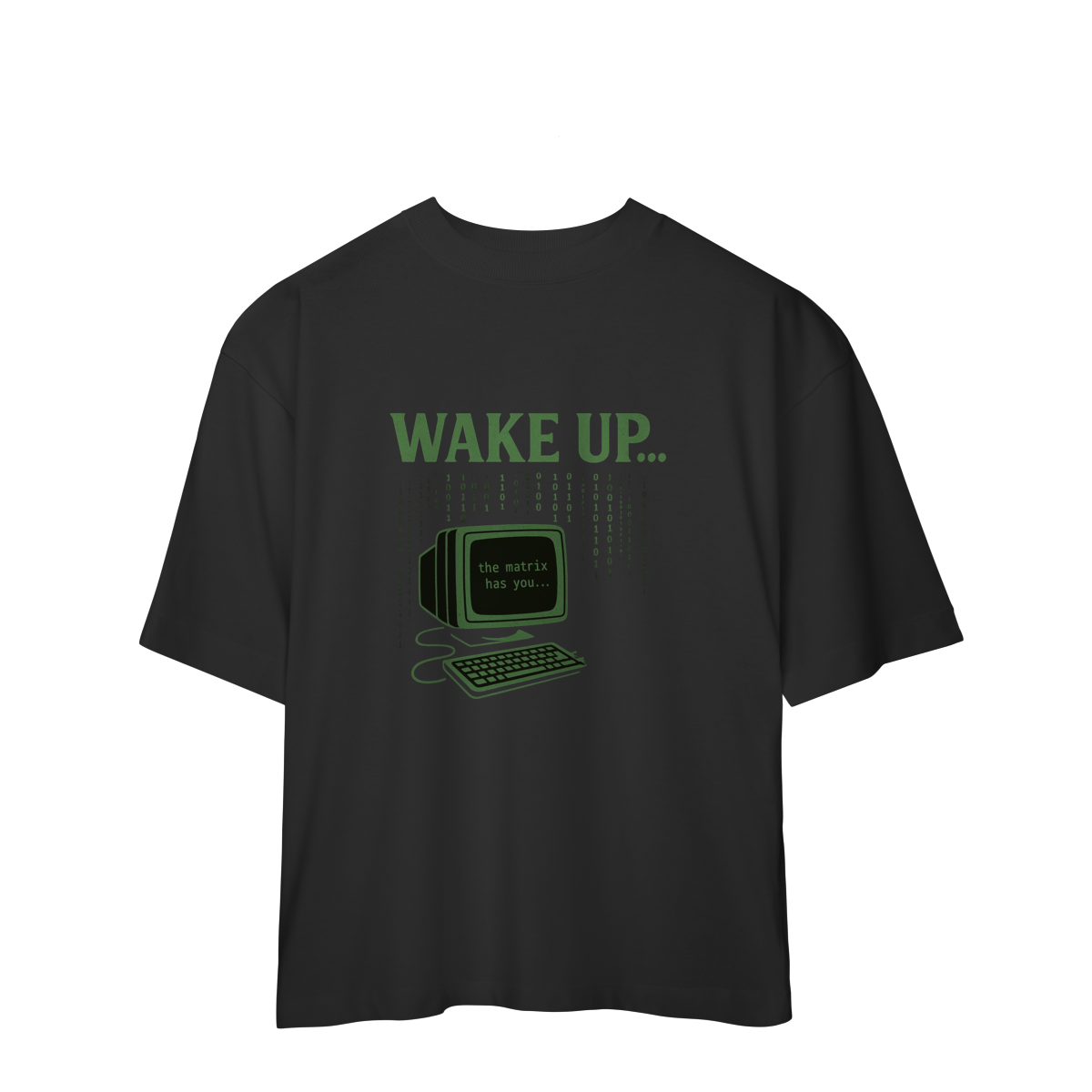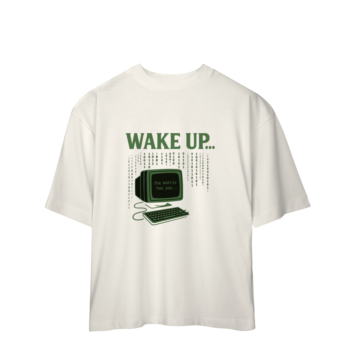 WAKE UP, THE MATRIX HAS YOU Esta estampa é inspirada no filme Matrix e no conceito de despertar da consciência. Ela convida à reflexão sobre rotinas automáticas, distrações constantes e controles invisíveis, provocando um olhar mais atento sobre presença, escolha e liberdade mental.
