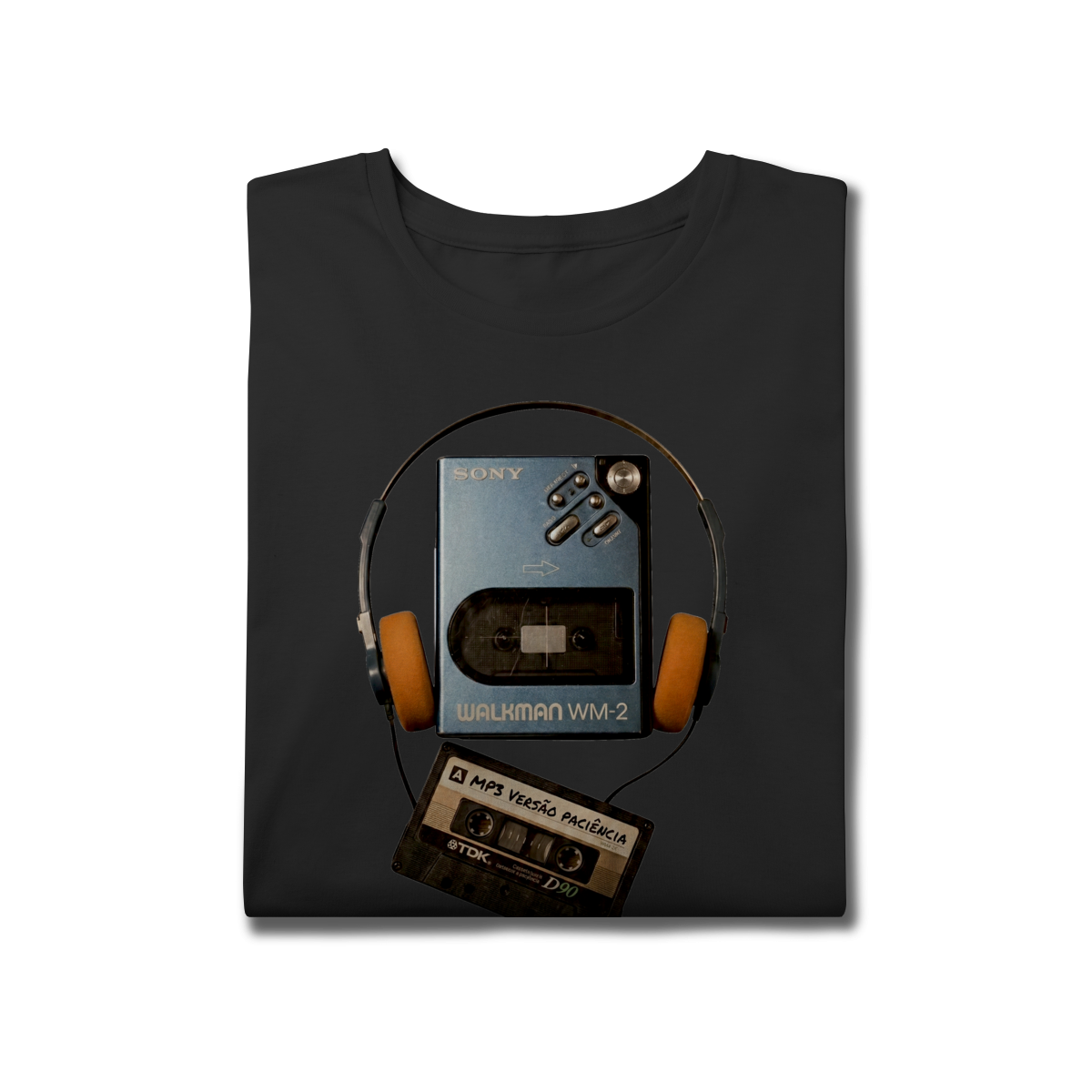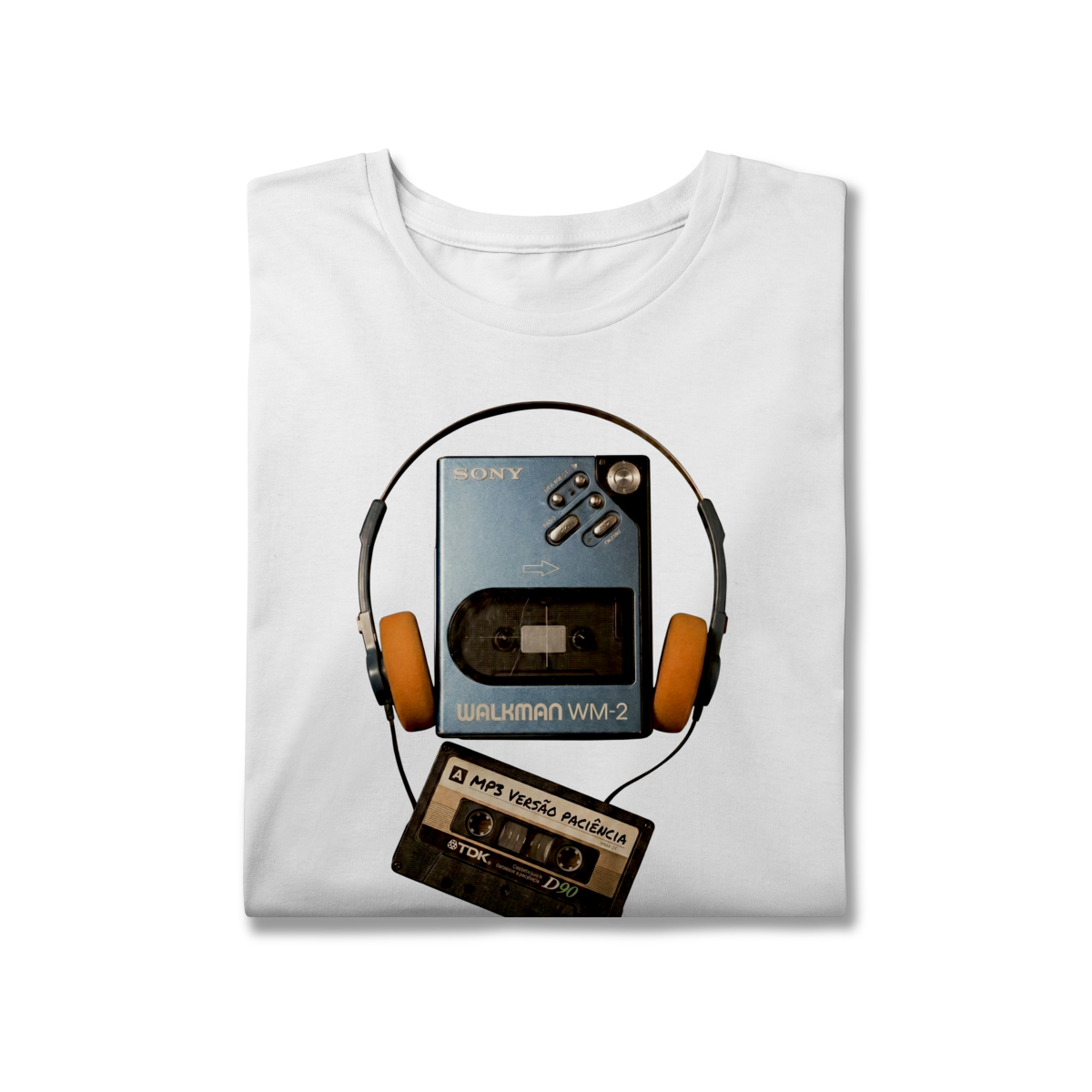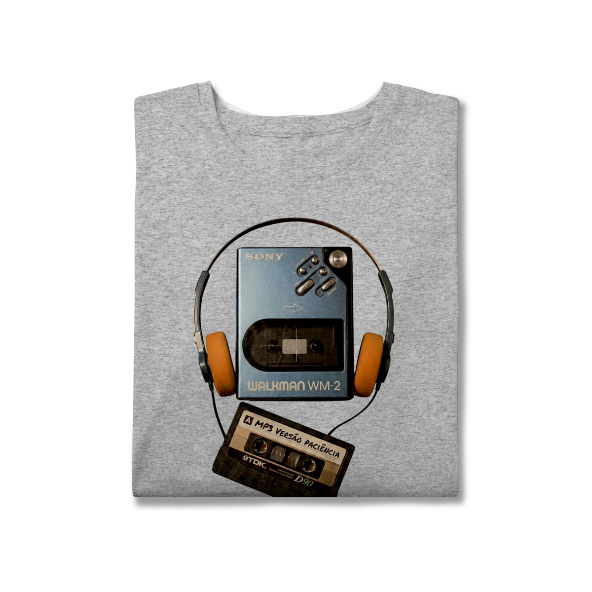 “MP3 – versão paciência” é o choque entre dois mundos: a pressa digital e a força de quem sabia esperar. A fita no walkman lembra que nem tudo era instantâneo — e exatamente por isso tinha valor. Esta estampa é um manifesto silencioso contra o imediatismo e a favor da presença real. Vista resiliência. Vista Presença Offline.