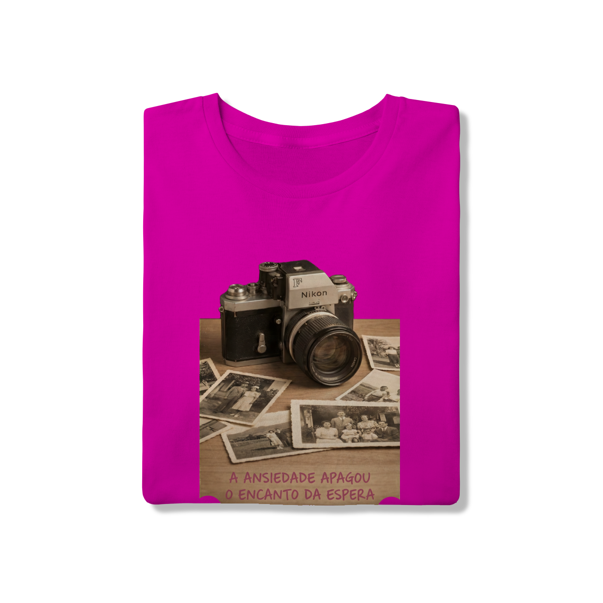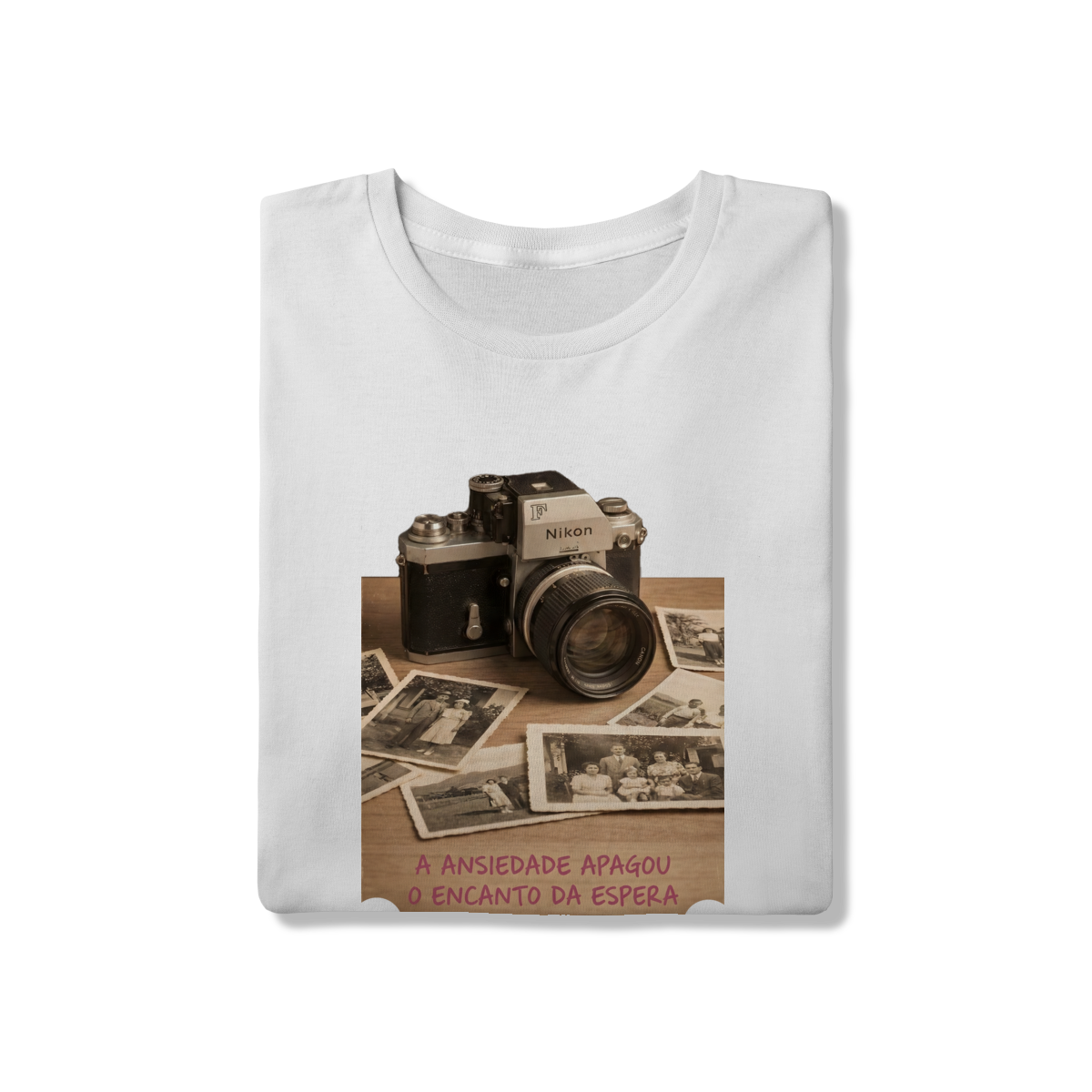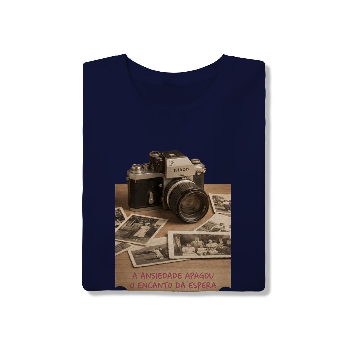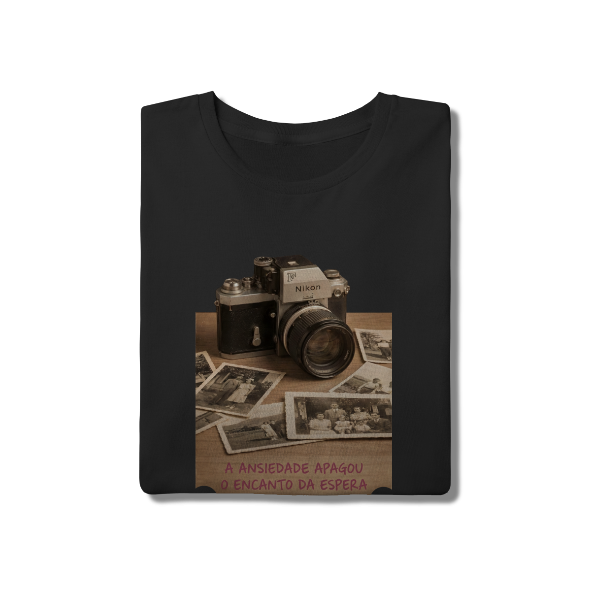 “O Encanto da Espera” resgata um tempo em que cada clique carregava expectativa, silêncio e significado. A câmera antiga e as fotos amareladas lembram que a beleza não estava na velocidade, mas na revelação. Esta estampa é um manifesto contra o imediatismo e a favor de memórias vividas com presença. Vista o tempo ao seu favor.