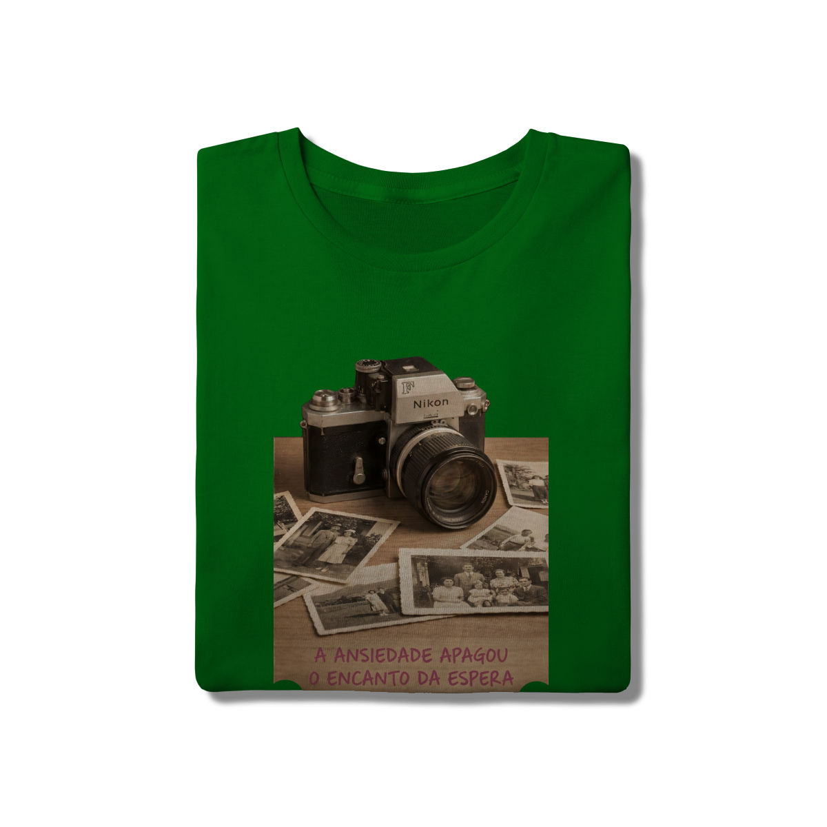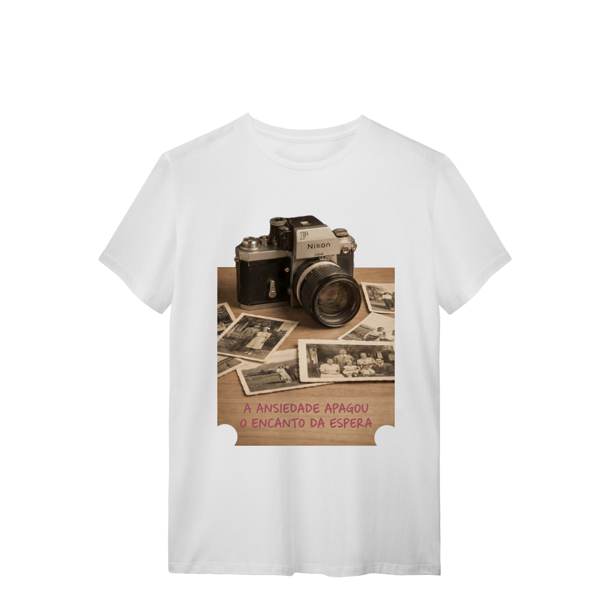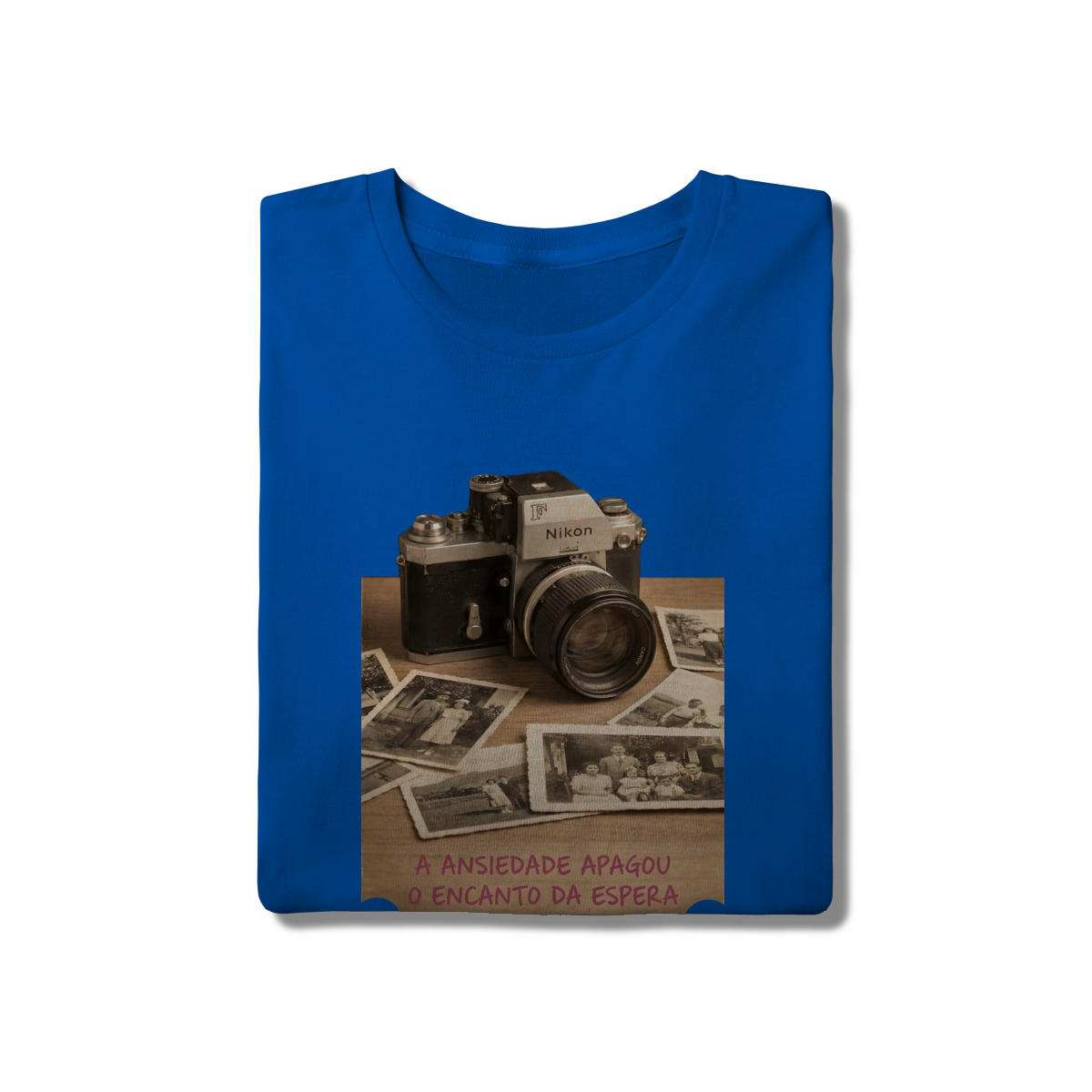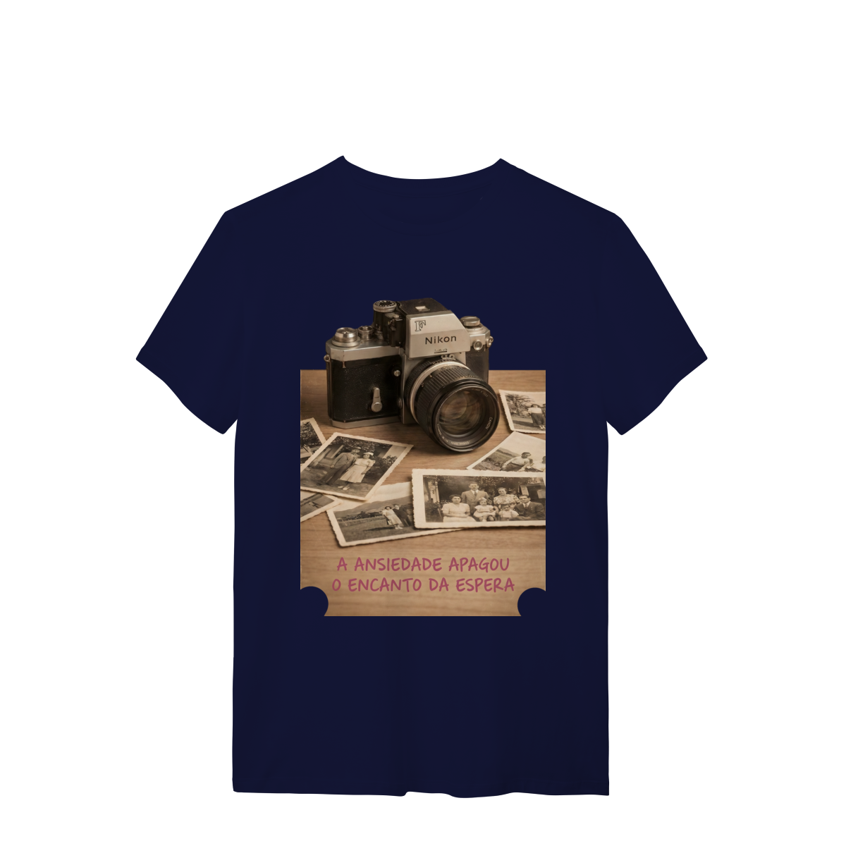 “O Encanto da Espera” resgata um tempo em que cada clique carregava expectativa, silêncio e significado. A câmera antiga e as fotos amareladas lembram que a beleza não estava na velocidade, mas na revelação. Esta estampa é um manifesto contra o imediatismo e a favor de memórias vividas com presença. Vista o tempo ao seu favor.