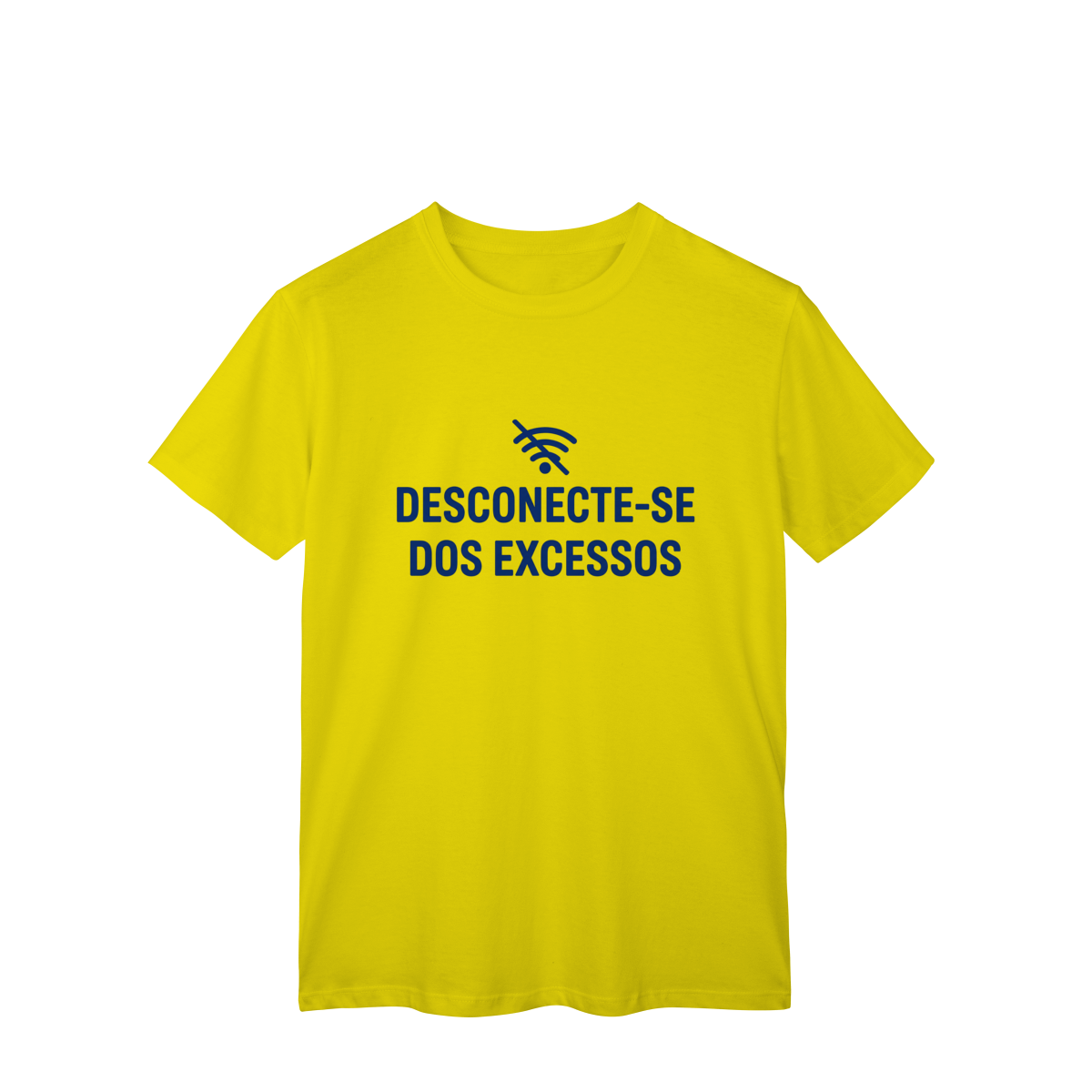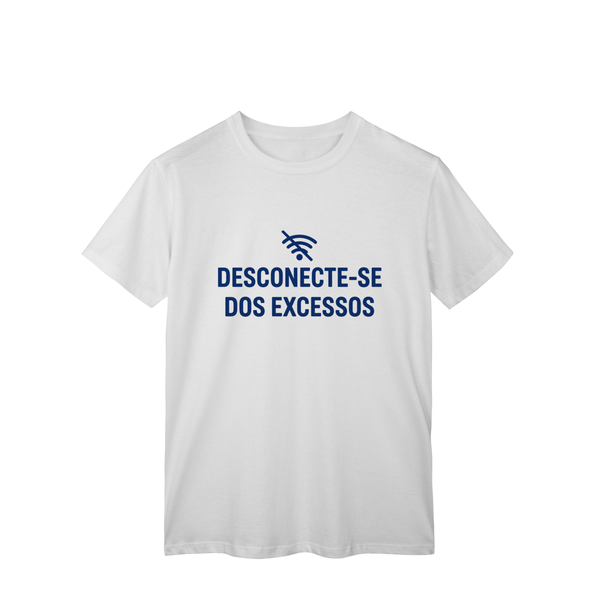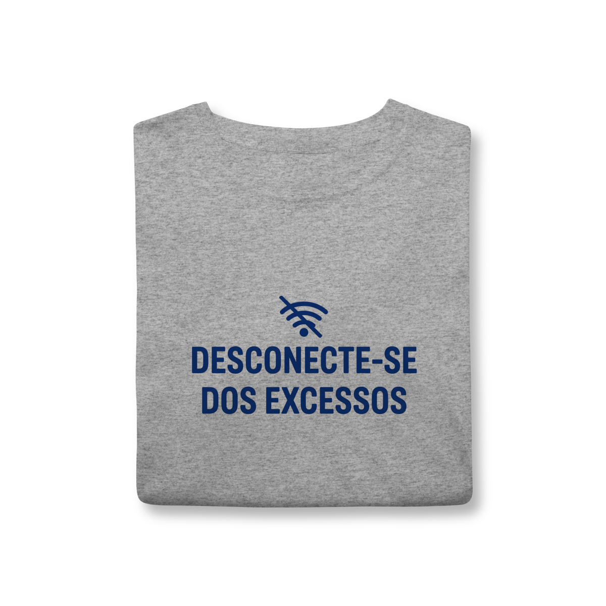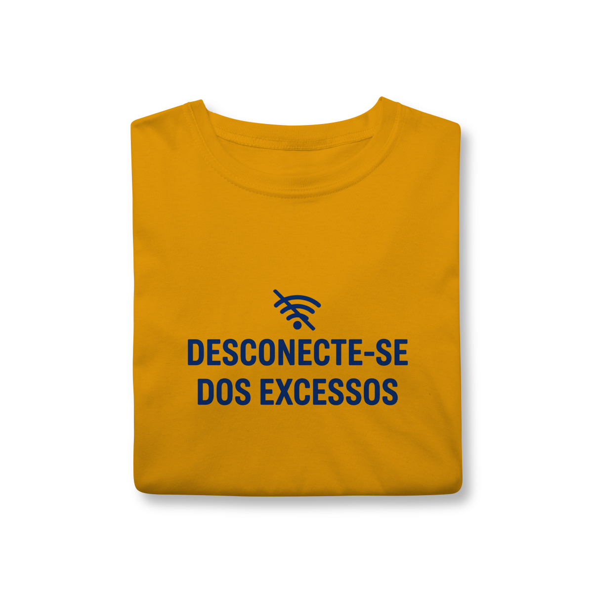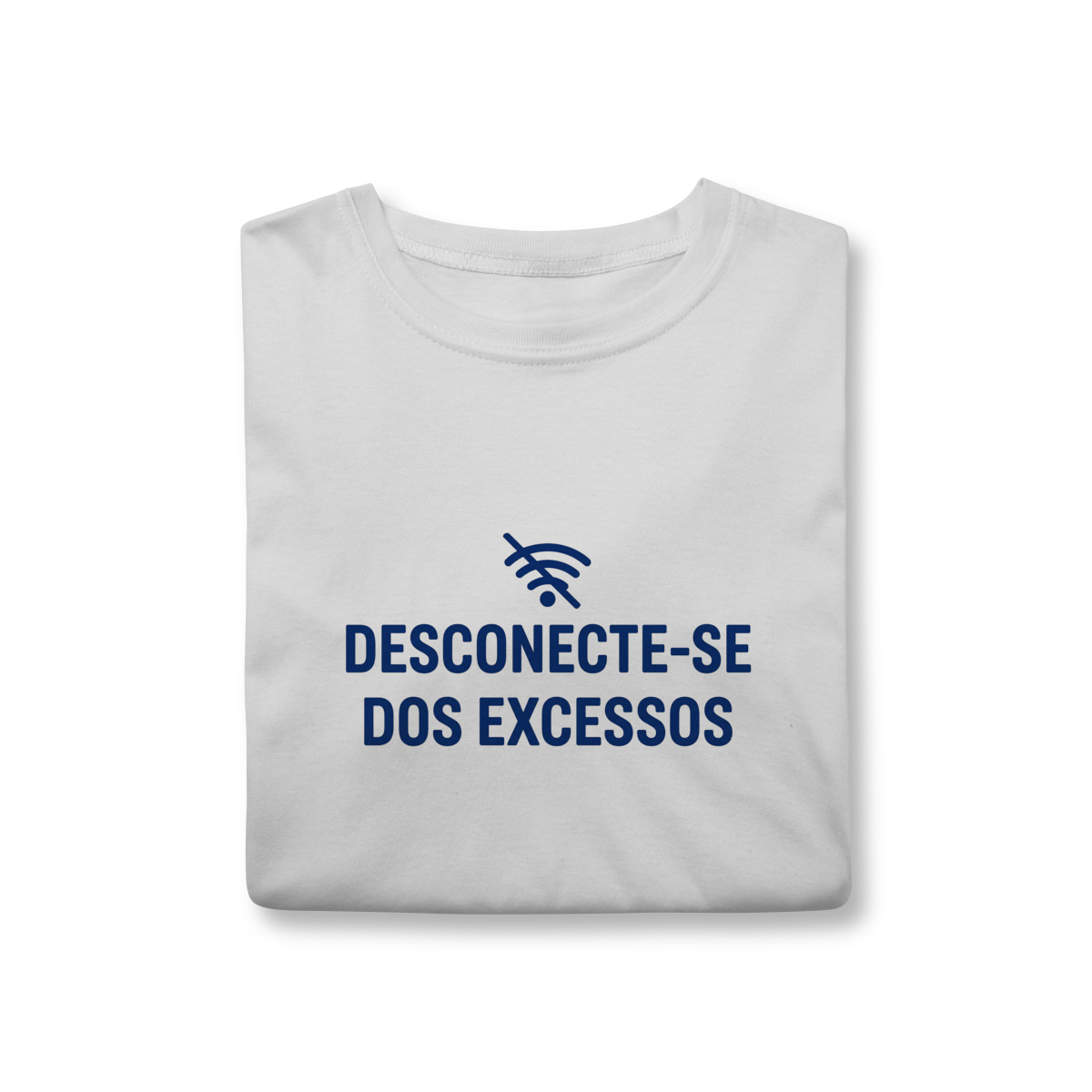 DESCONECTE-SE DOS EXCESSOS convida a interromper o fluxo contínuo de estímulos. A estampa aponta para a redução do ruído como condição para clareza e presença. Uma peça que lembra que menos distração abre espaço para aquilo que sustenta sentido, profundidade e direção.