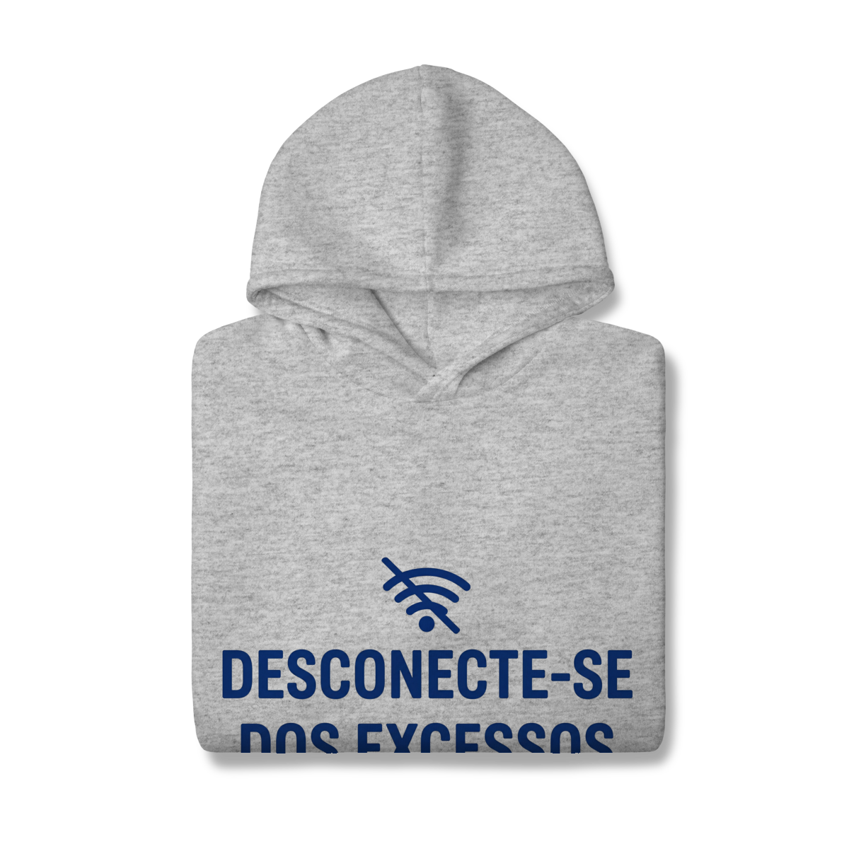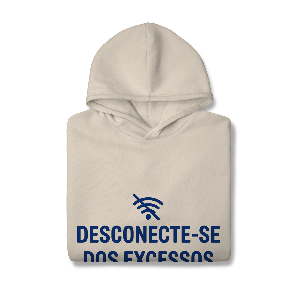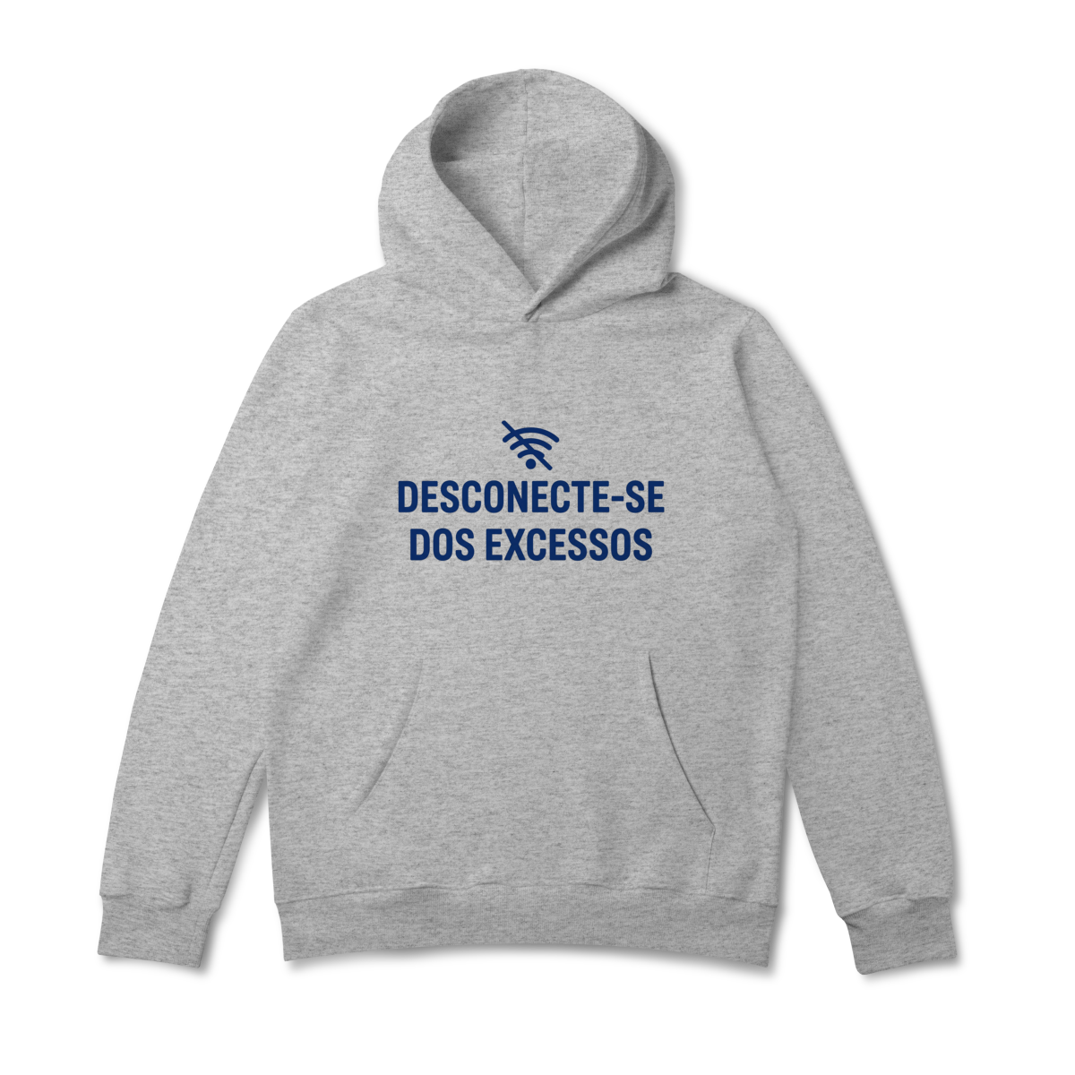 DESCONECTE-SE DOS EXCESSOS convida a interromper o fluxo contínuo de estímulos. A estampa aponta para a redução do ruído como condição para clareza e presença. Uma peça que lembra que menos distração abre espaço para aquilo que sustenta sentido, profundidade e direção.
