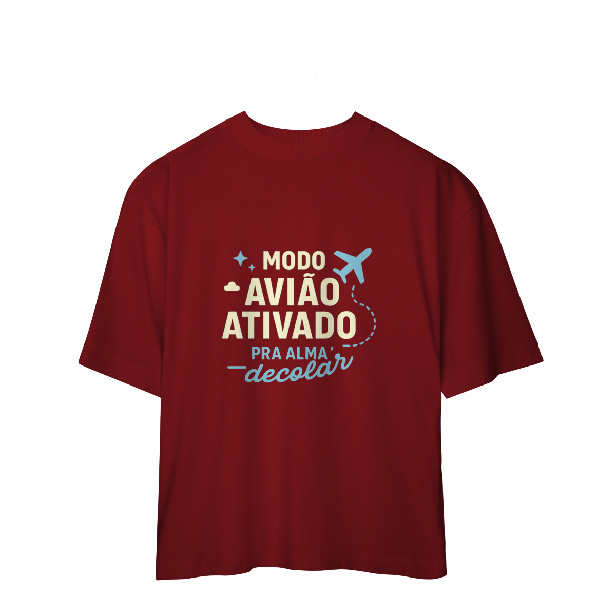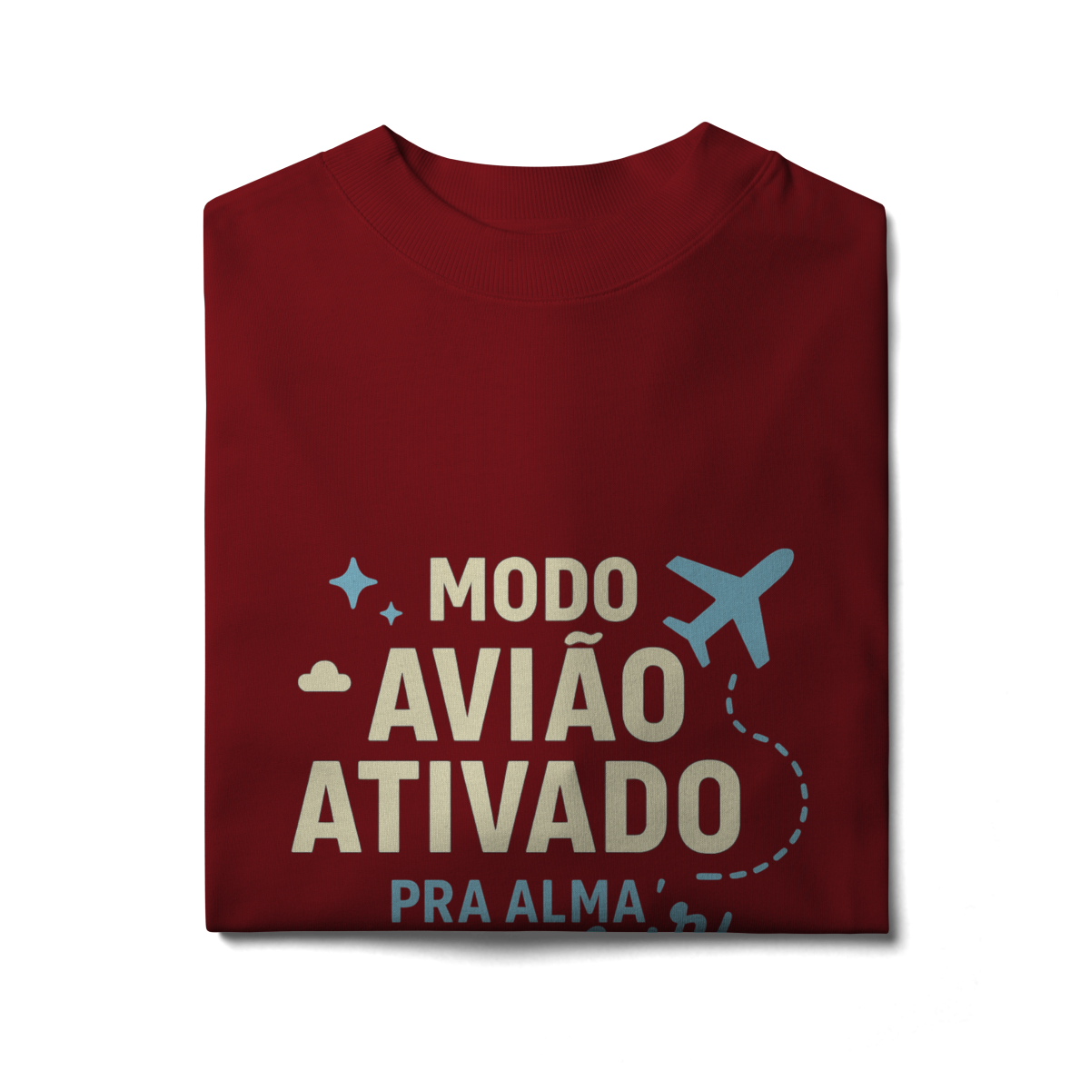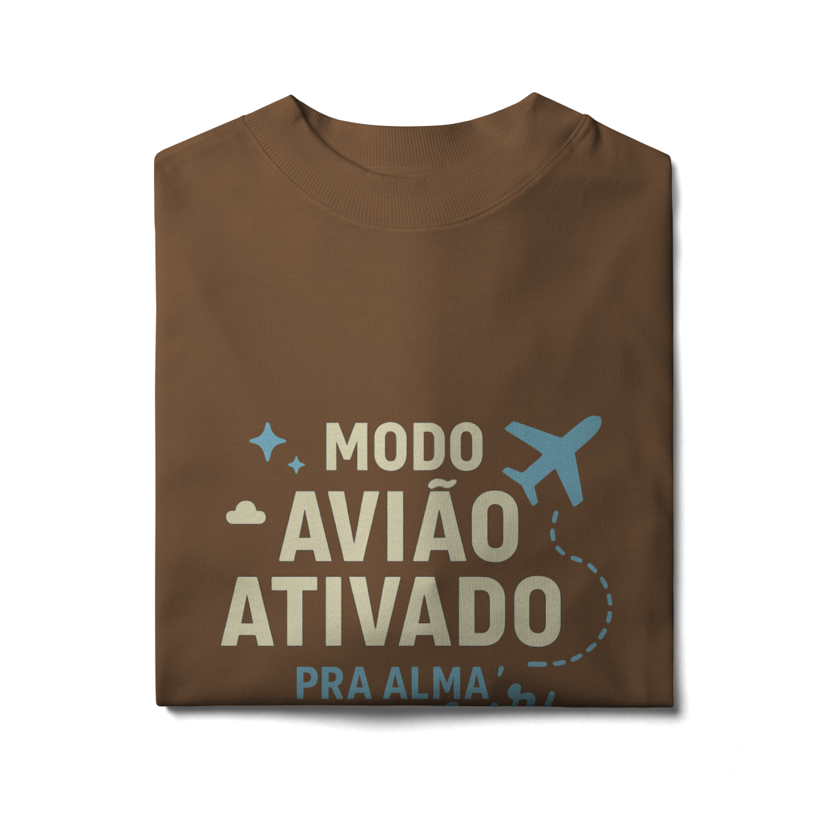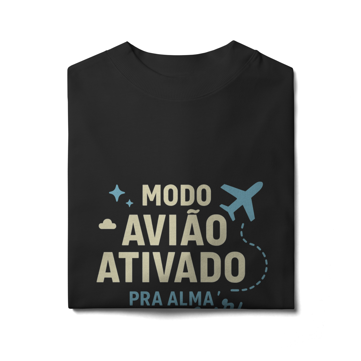 MODO AVIÃO ATIVADO, PARA A ALMA DECOLAR propõe o desligamento consciente como condição para reconexão interna. A estampa indica que reduzir estímulos cria espaço para clareza, presença e aprofundamento. Uma peça que afirma que afastar-se do ruído é o que permite desenvolver-se como pessoa.
