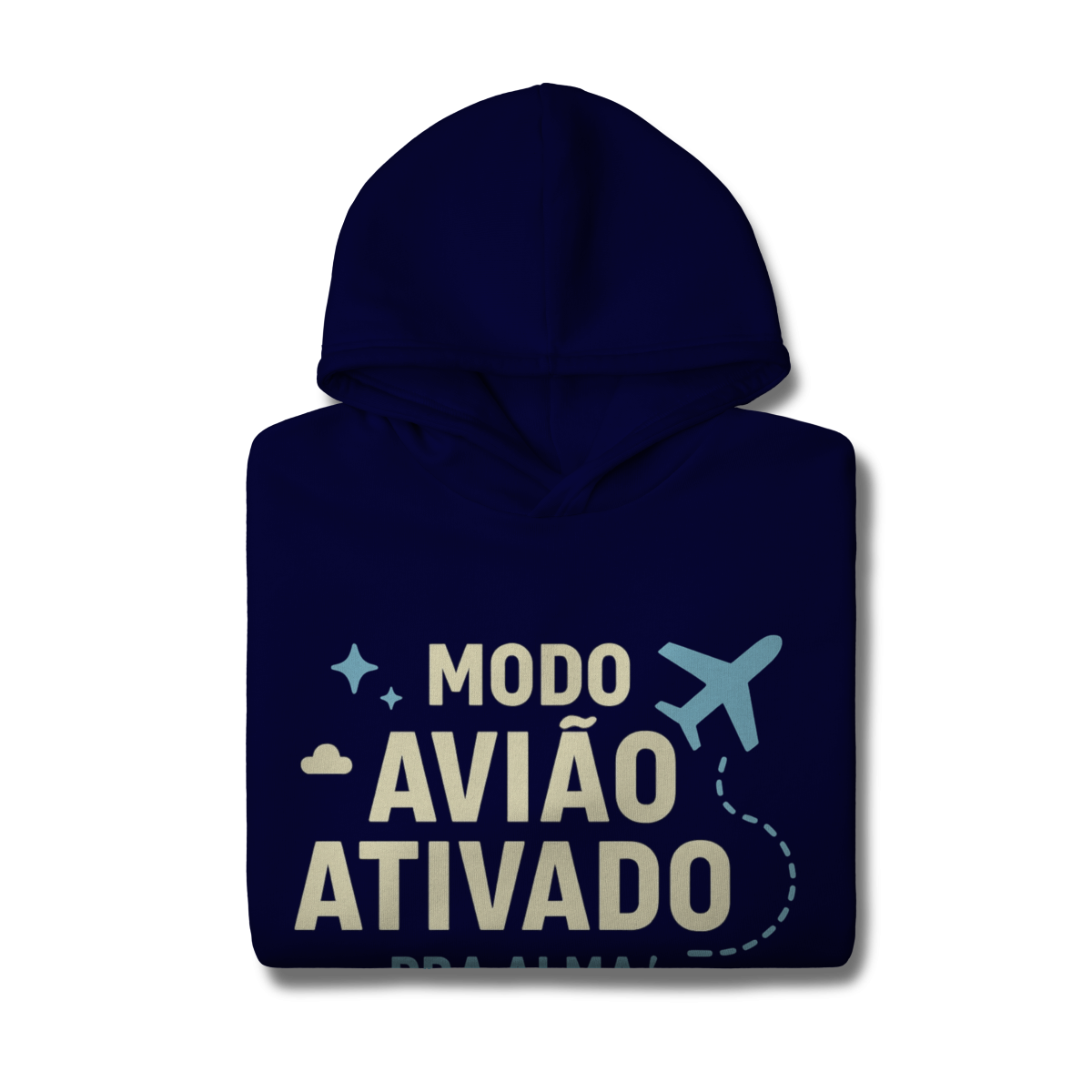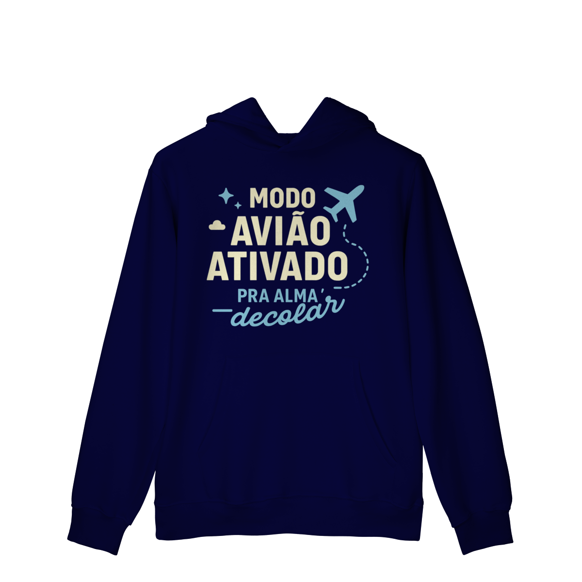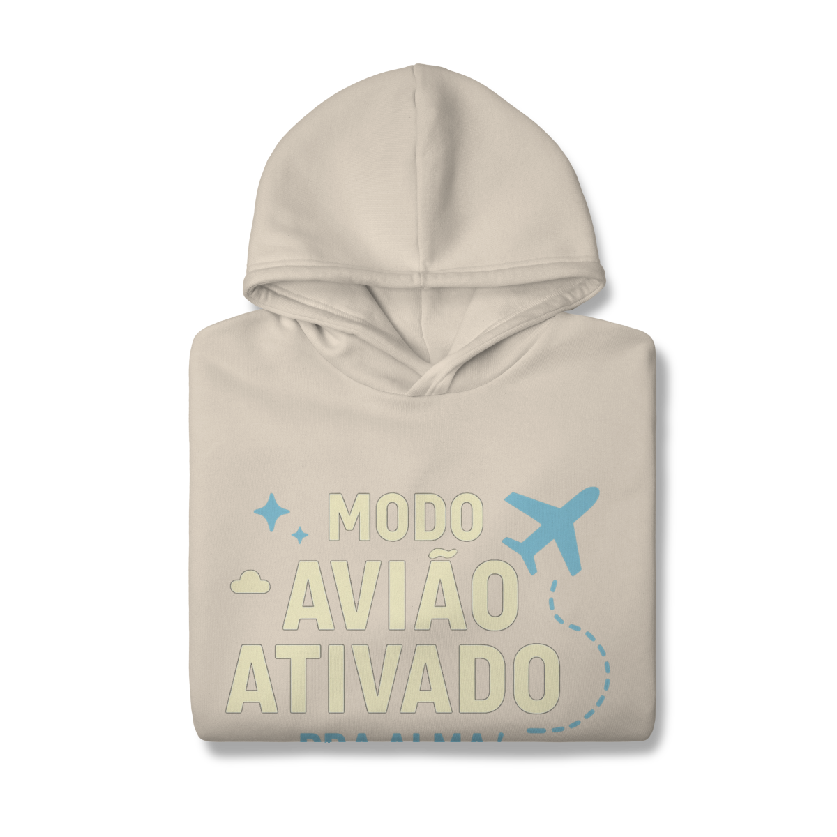 MODO AVIÃO ATIVADO, PARA A ALMA DECOLAR propõe o desligamento consciente como condição para reconexão interna. A estampa indica que reduzir estímulos cria espaço para clareza, presença e aprofundamento. Uma peça que afirma que afastar-se do ruído é o que permite desenvolver-se como pessoa.