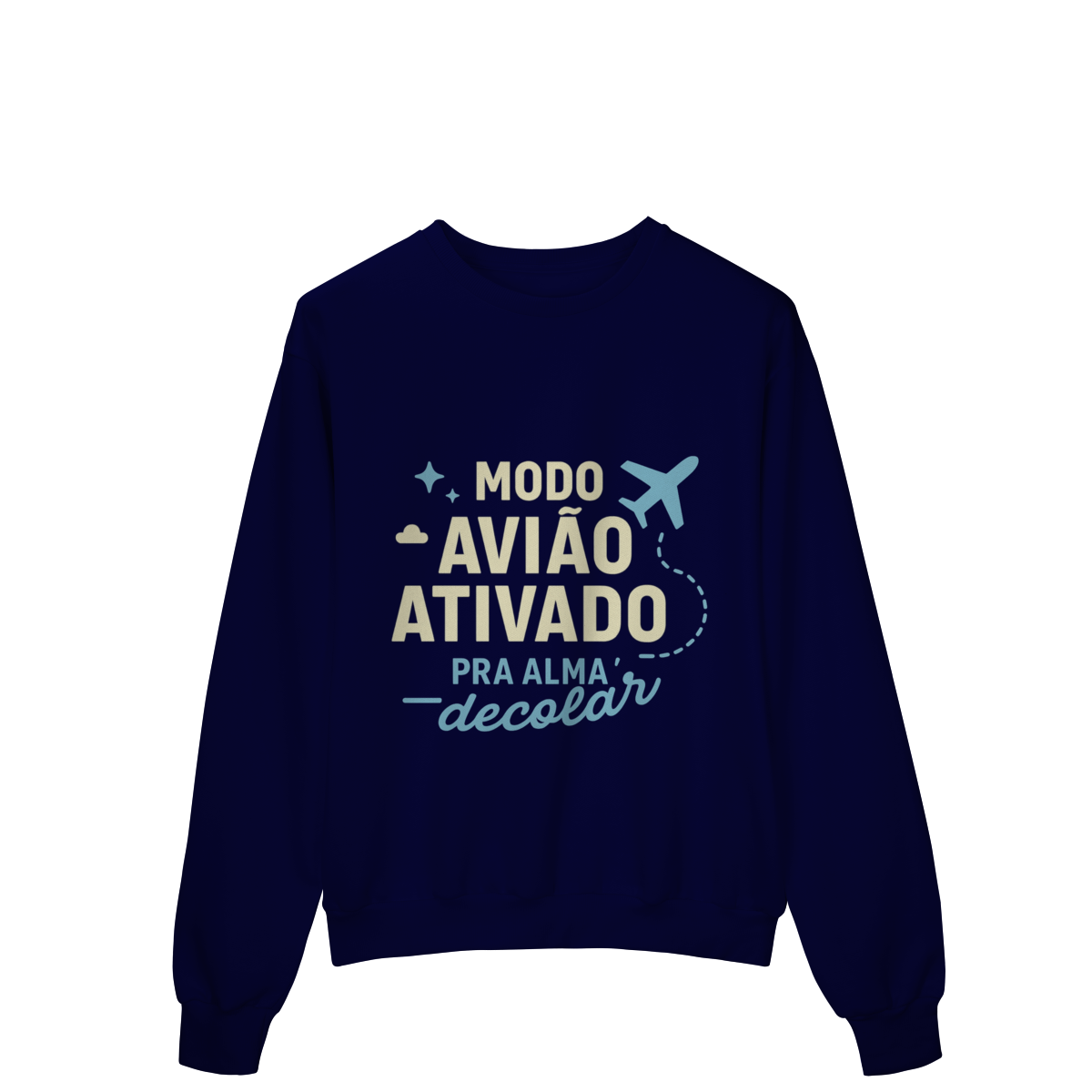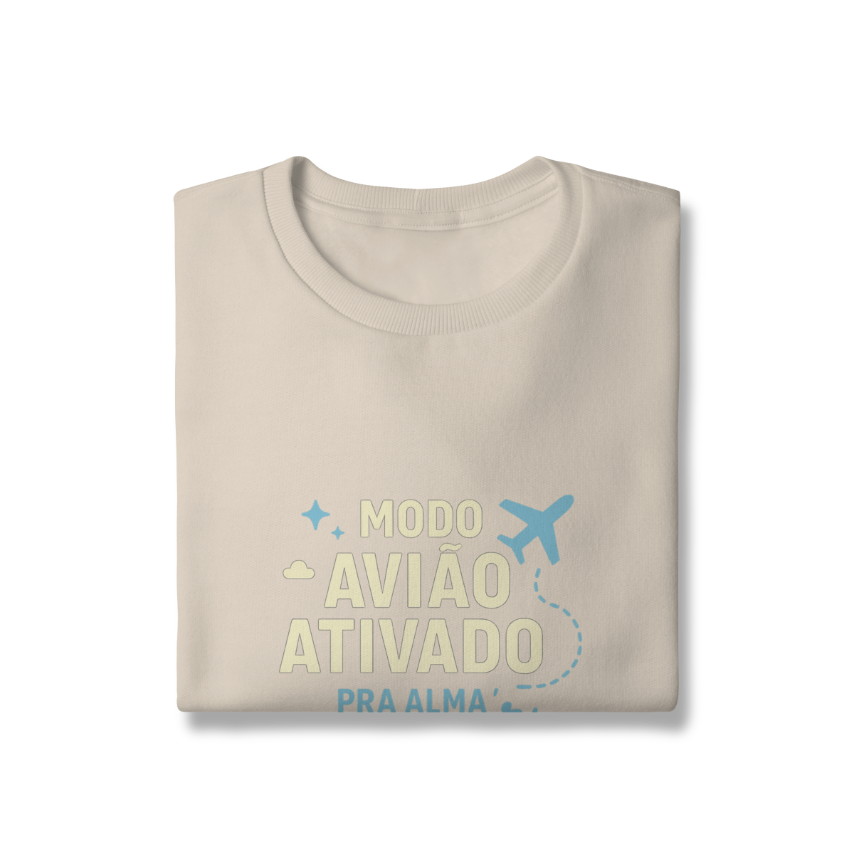 MODO AVIÃO ATIVADO, PARA A ALMA DECOLAR propõe o desligamento consciente como condição para reconexão interna. A estampa indica que reduzir estímulos cria espaço para clareza, presença e aprofundamento. Uma peça que afirma que afastar-se do ruído é o que permite desenvolver-se como pessoa.