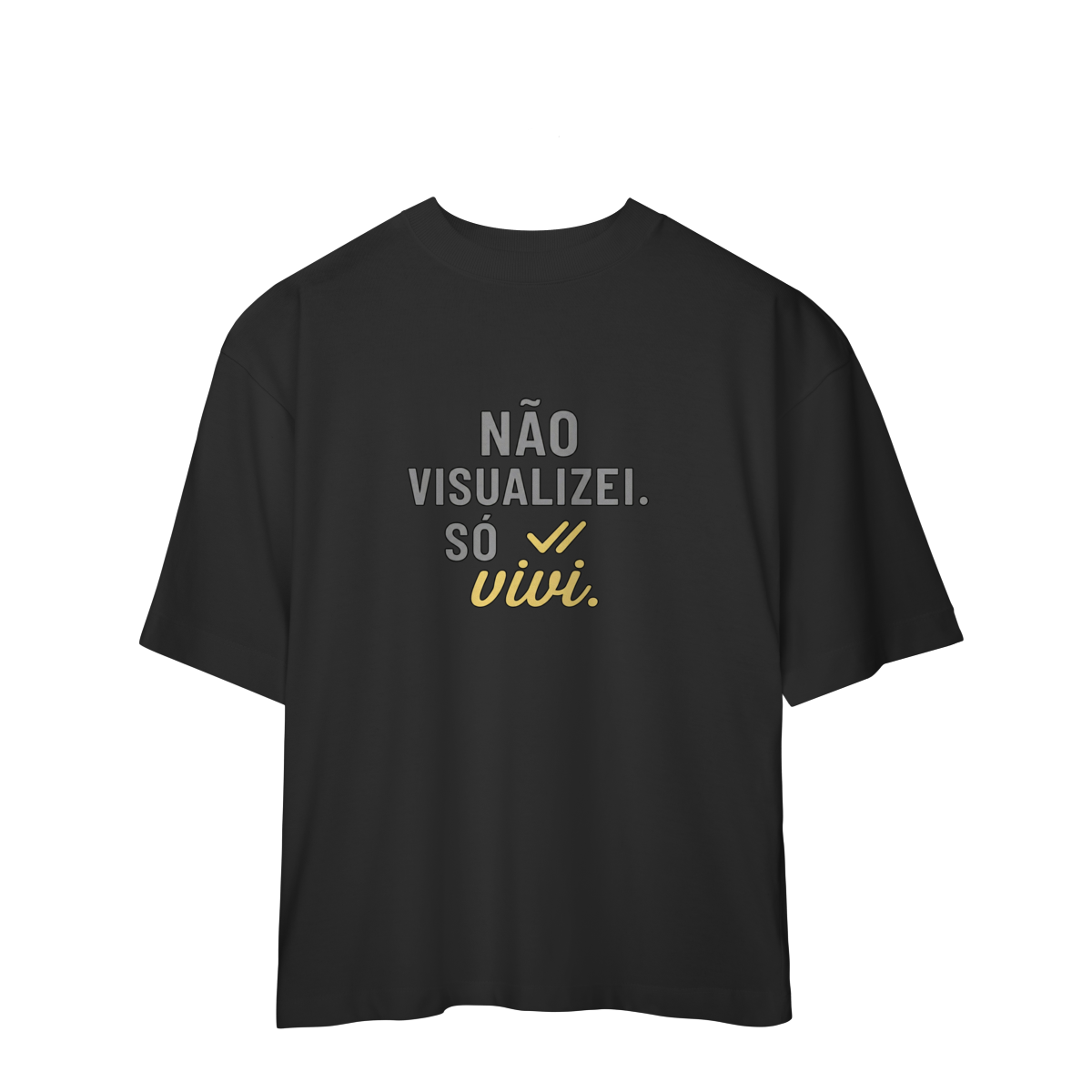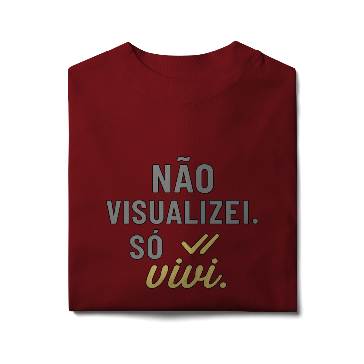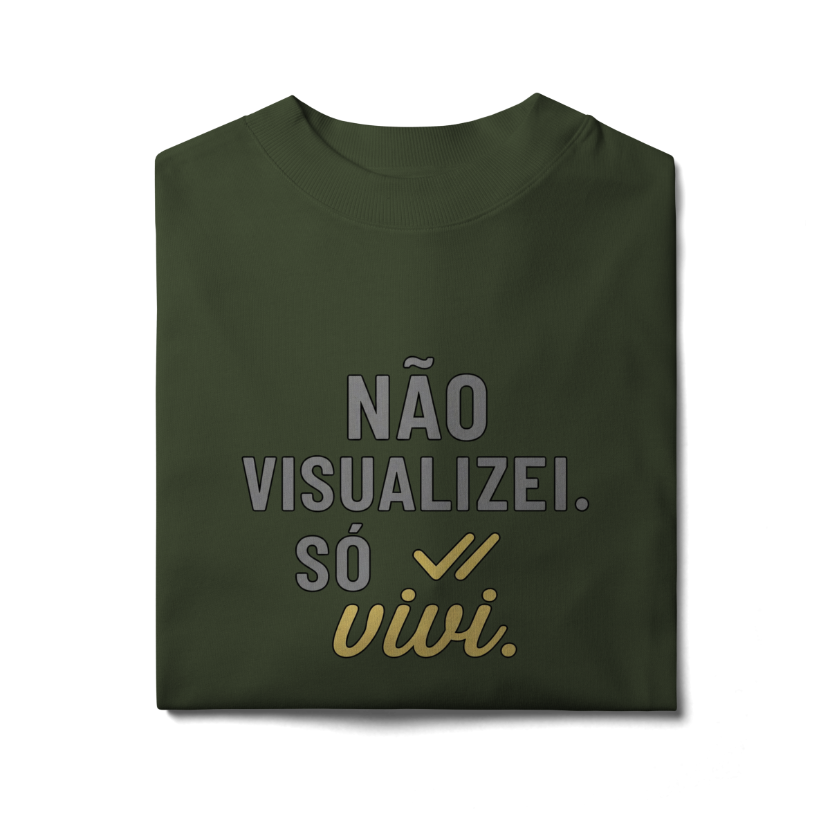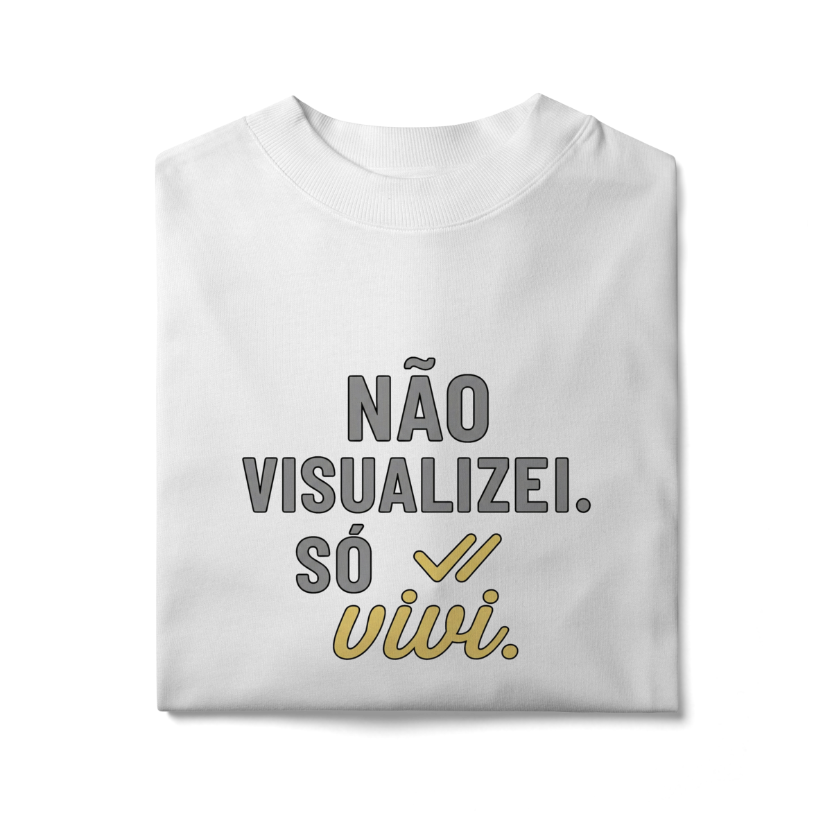 NÃO VISUALIZEI, SÓ VIVI reforça a escolha pela experiência direta em vez da exposição constante. A estampa destaca que crescimento acontece no vivido, não no que é mostrado ou avaliado. Uma peça que propõe menos atenção à opinião dos outros e mais presença no que realmente transforma.