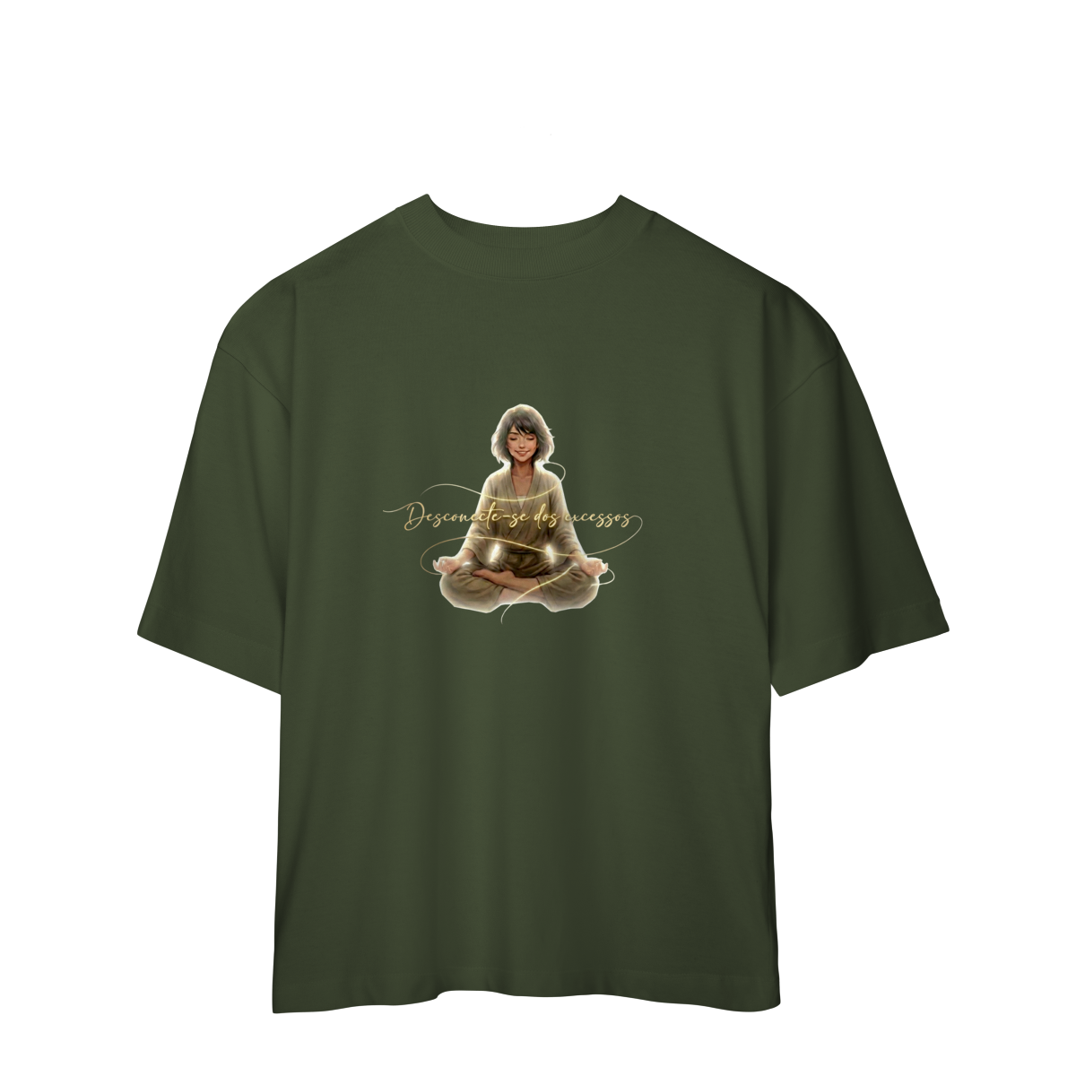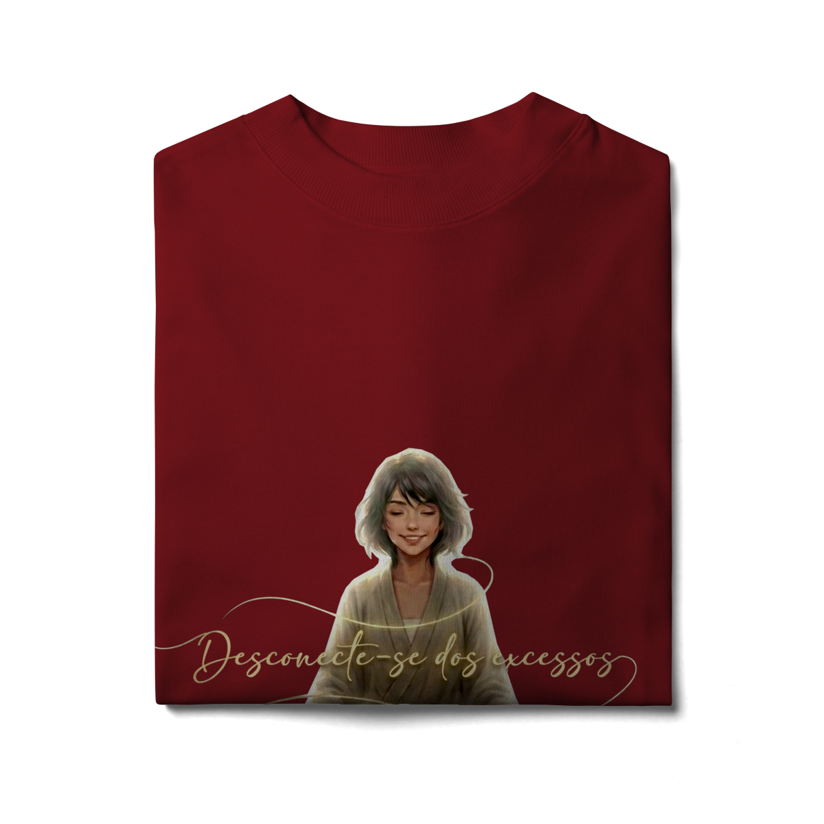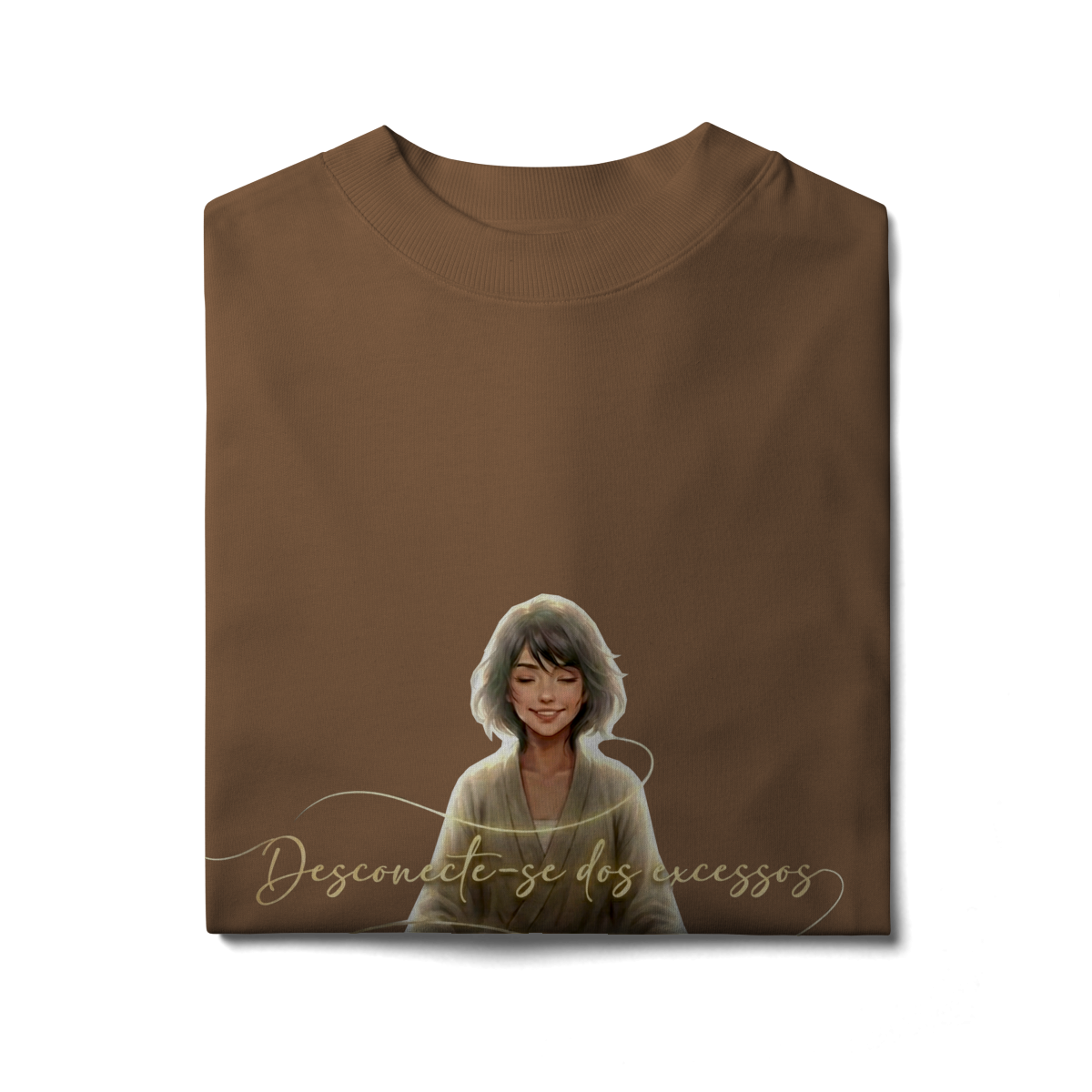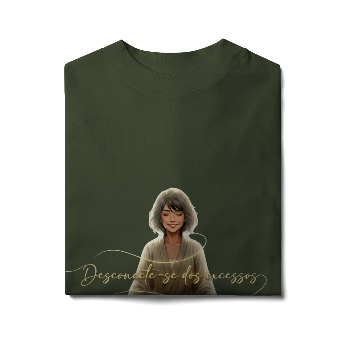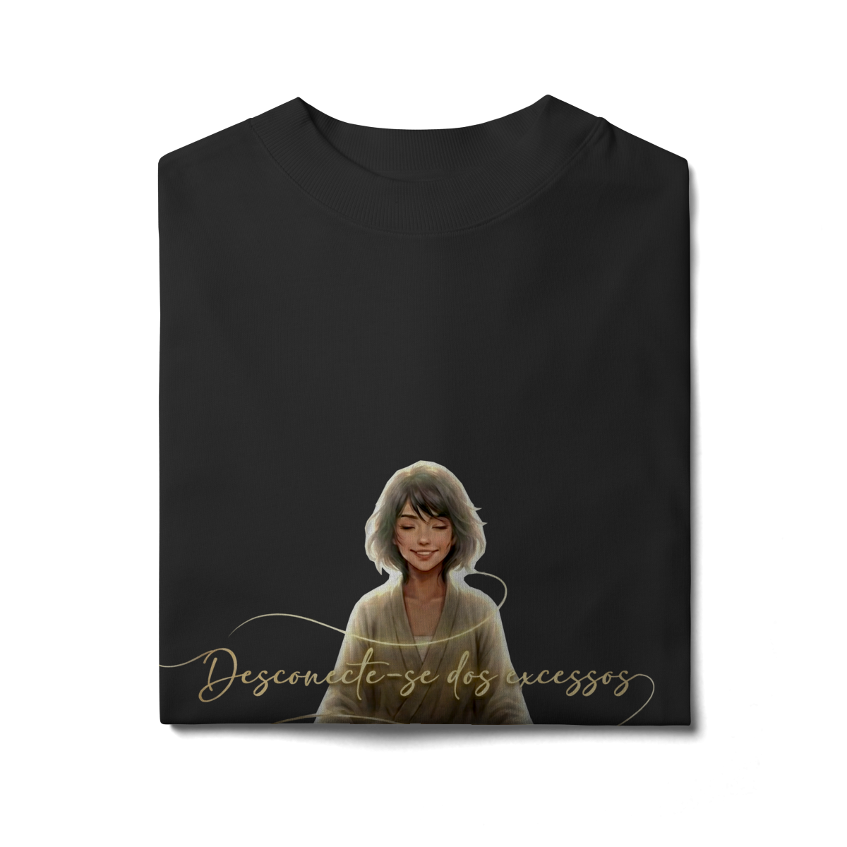 DESCONECTE-SE DOS EXCESSOS convida a interromper o fluxo contínuo de estímulos. A estampa aponta para a redução do ruído como condição para clareza e presença. Uma peça que lembra que menos distração abre espaço para aquilo que sustenta sentido, profundidade e direção.