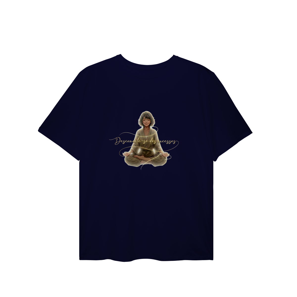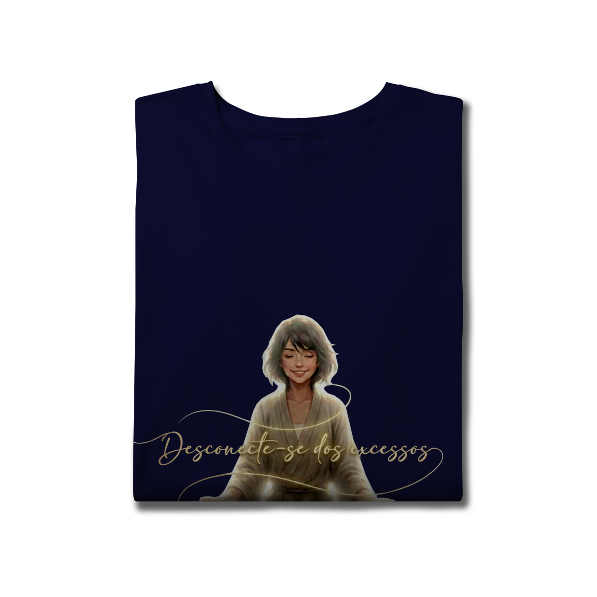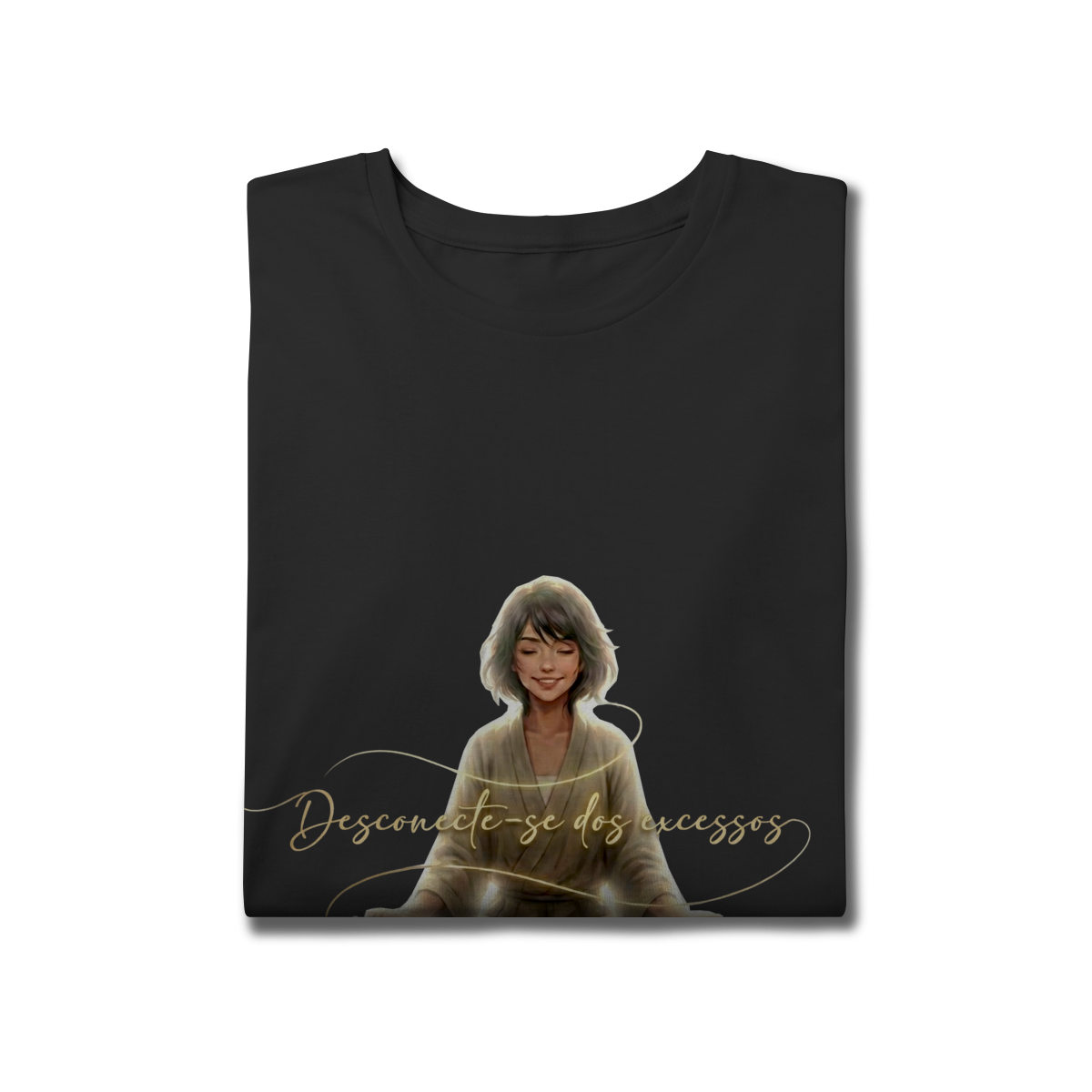DESCONECTE-SE DOS EXCESSOS convida a interromper o fluxo contínuo de estímulos. A estampa aponta para a redução do ruído como condição para clareza e presença. Uma peça que lembra que menos distração abre espaço para aquilo que sustenta sentido, profundidade e direção.