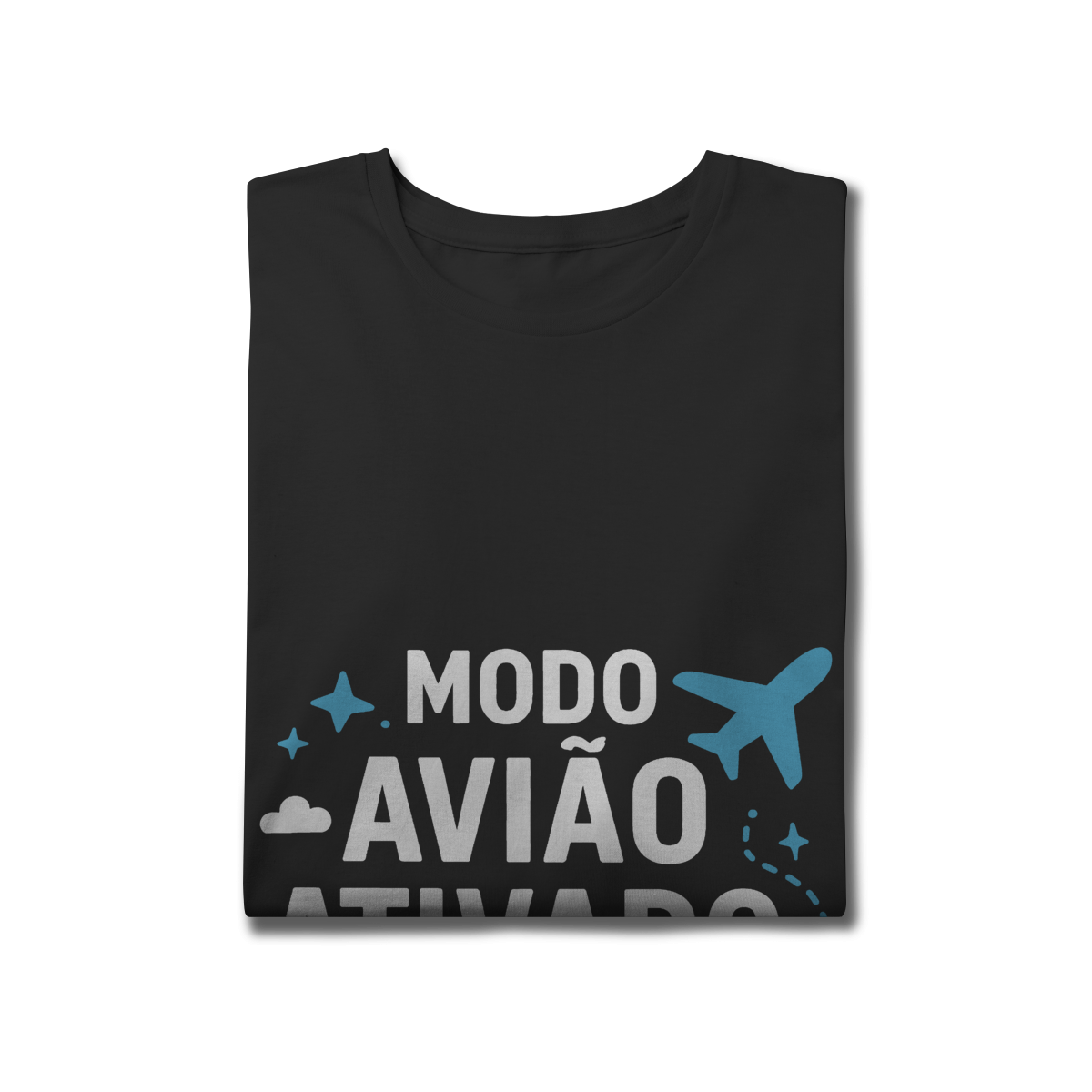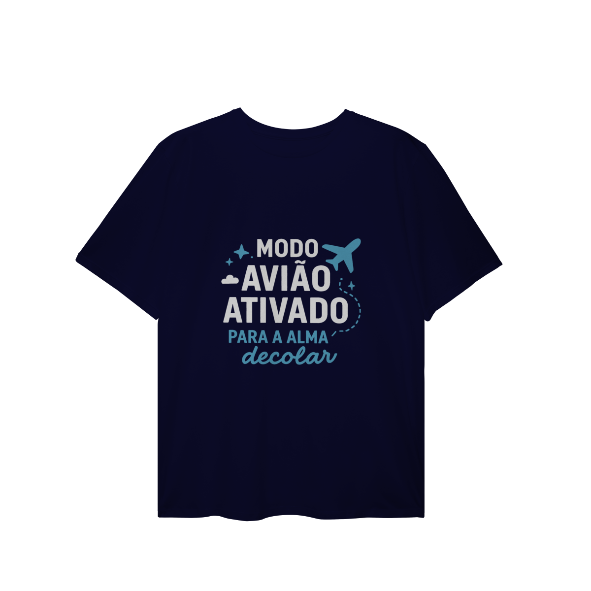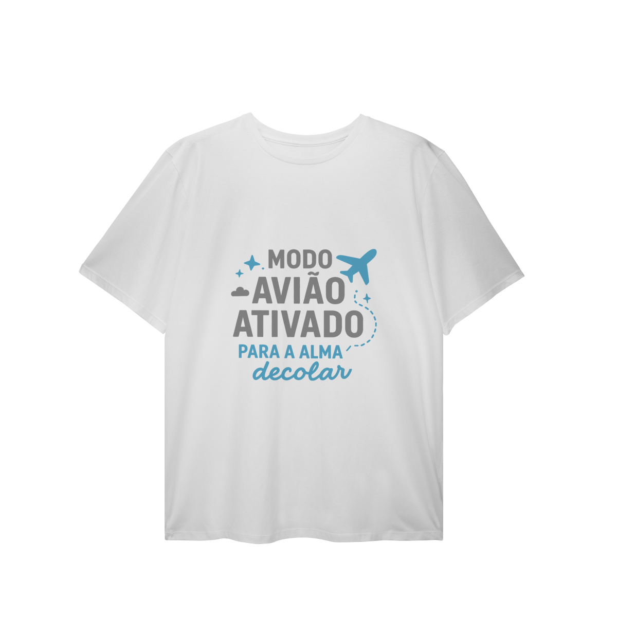 MODO AVIÃO ATIVADO, PARA A ALMA DECOLAR propõe o desligamento consciente como condição para reconexão interna. A estampa indica que reduzir estímulos cria espaço para clareza, presença e aprofundamento. Uma peça que afirma que afastar-se do ruído é o que permite desenvolver-se como pessoa.