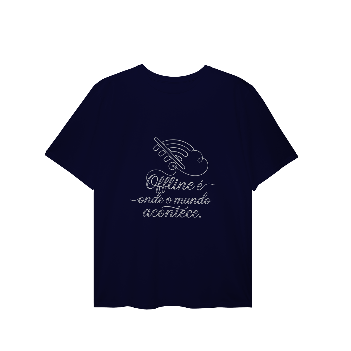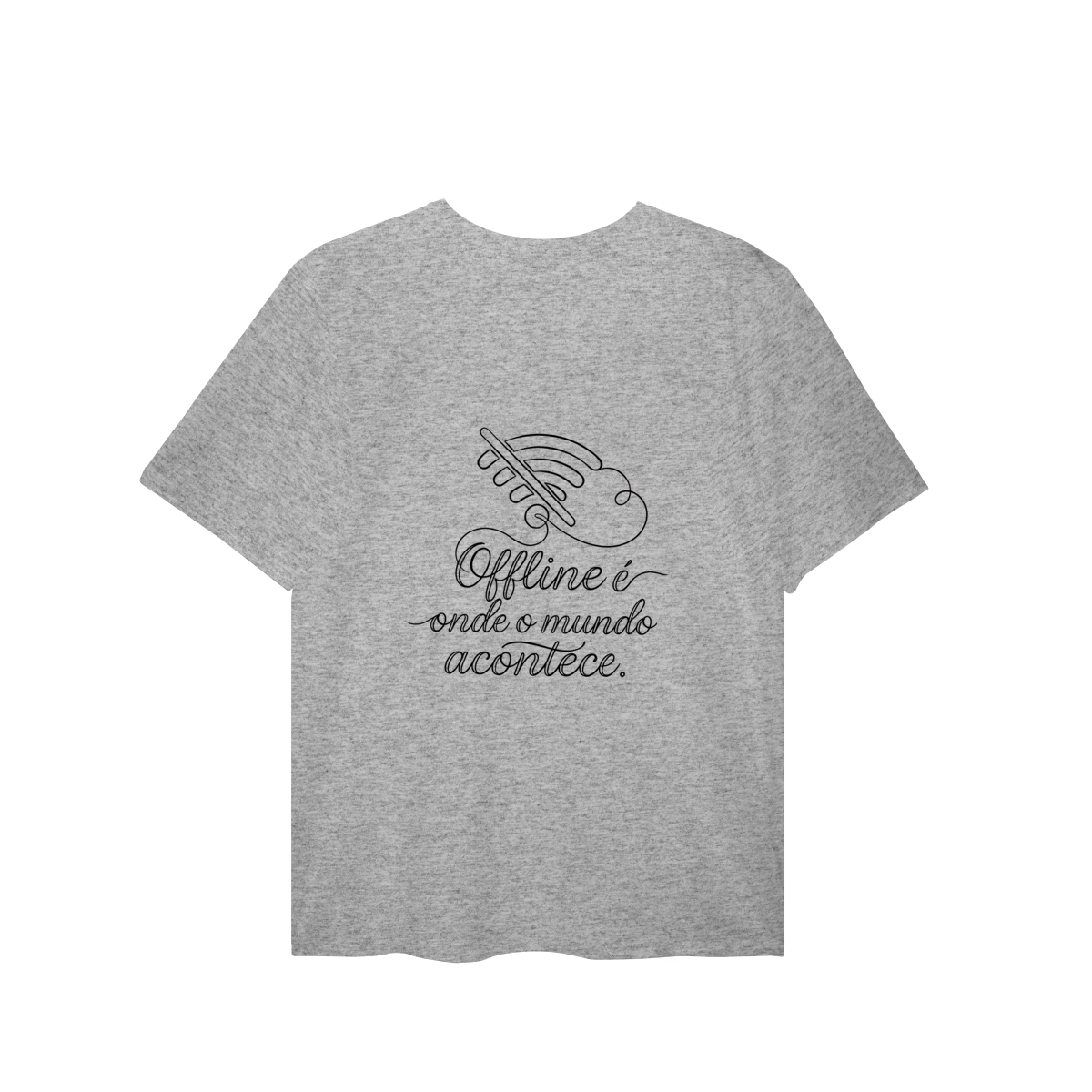 OFFLINE É ONDE O MUNDO ACONTECE reforça que as experiências que realmente constroem não dependem de tela, registro ou validação. Uma estampa que convida a viver com mais presença e menos mediação digital.
