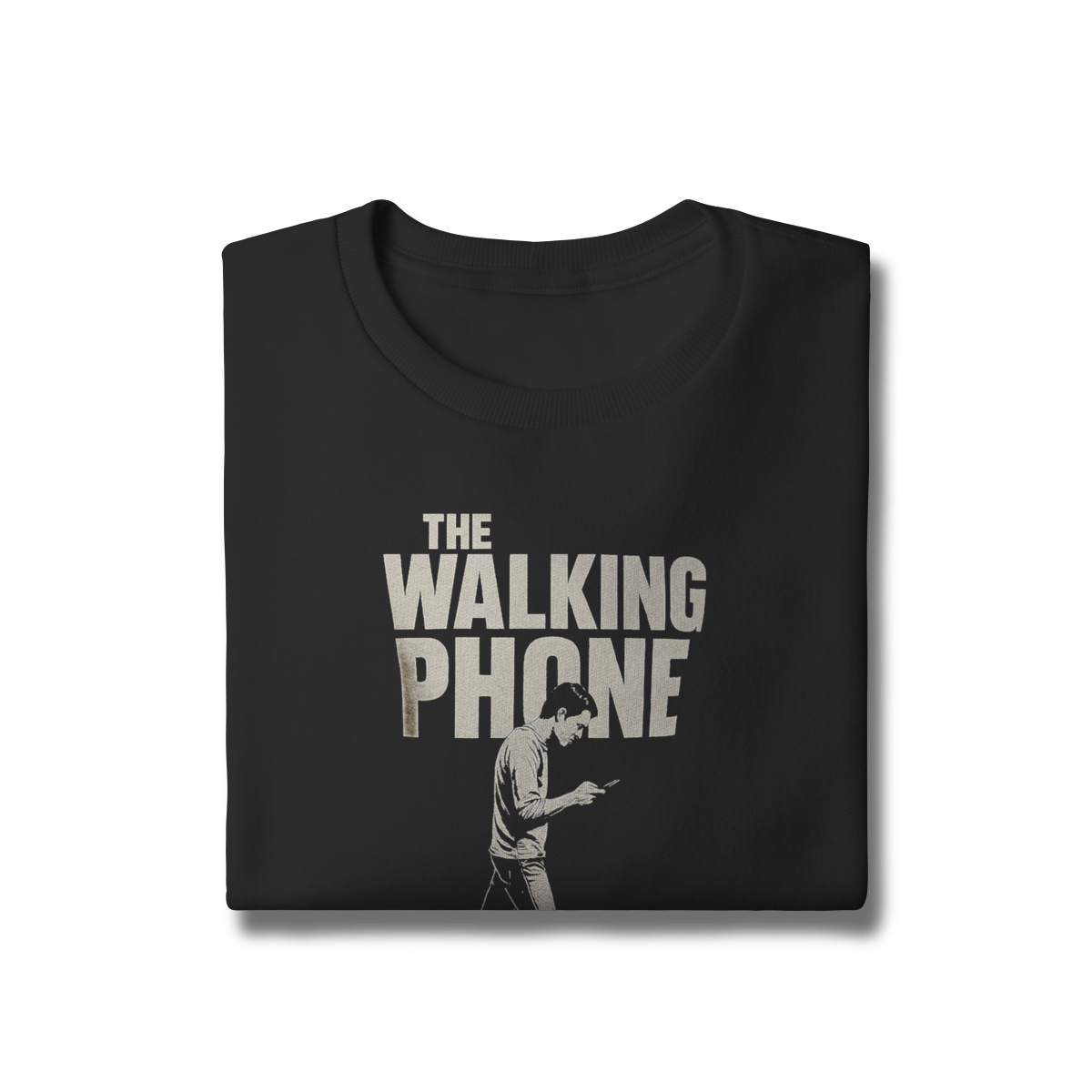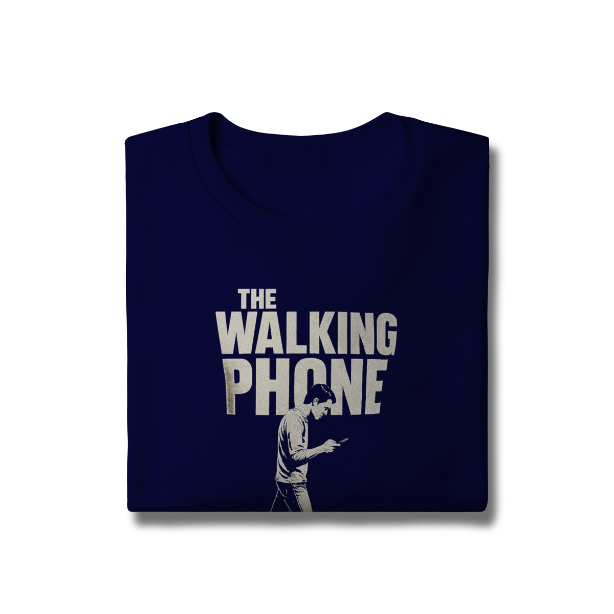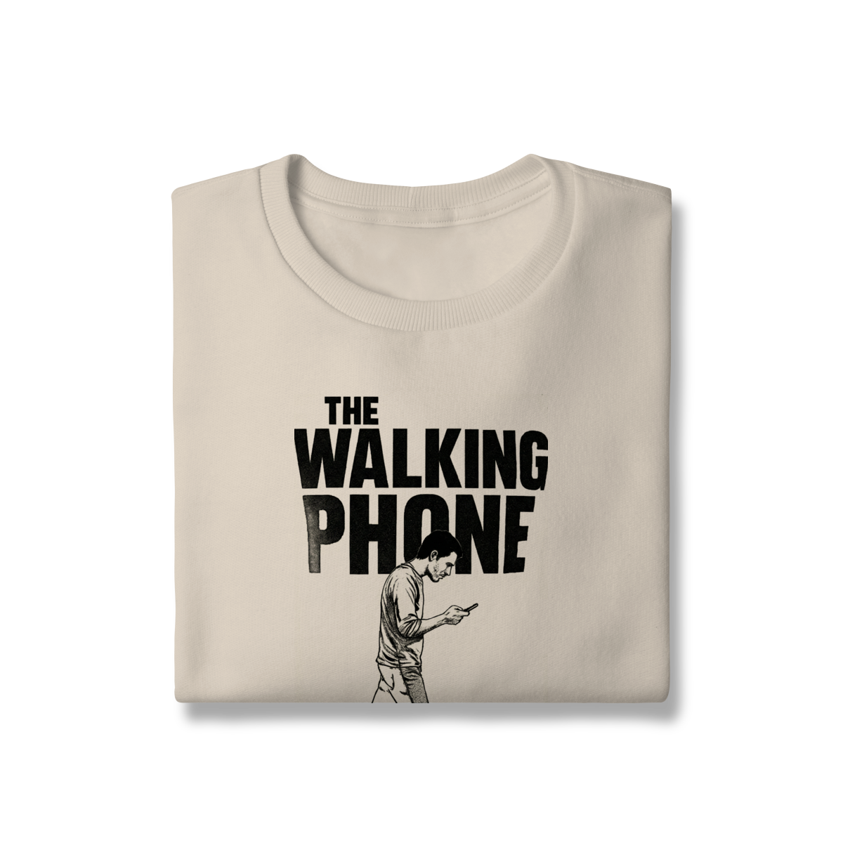 THE WALKING PHONE retrata o homem moderno andando no piloto automático, de cabeça baixa, guiado pela tela. Mais do que uma ironia visual, a estampa expõe um incômodo coletivo: uma sociedade viciada no celular. Esta peça comunica uma escolha clara — viver no real é melhor do que existir distraído.