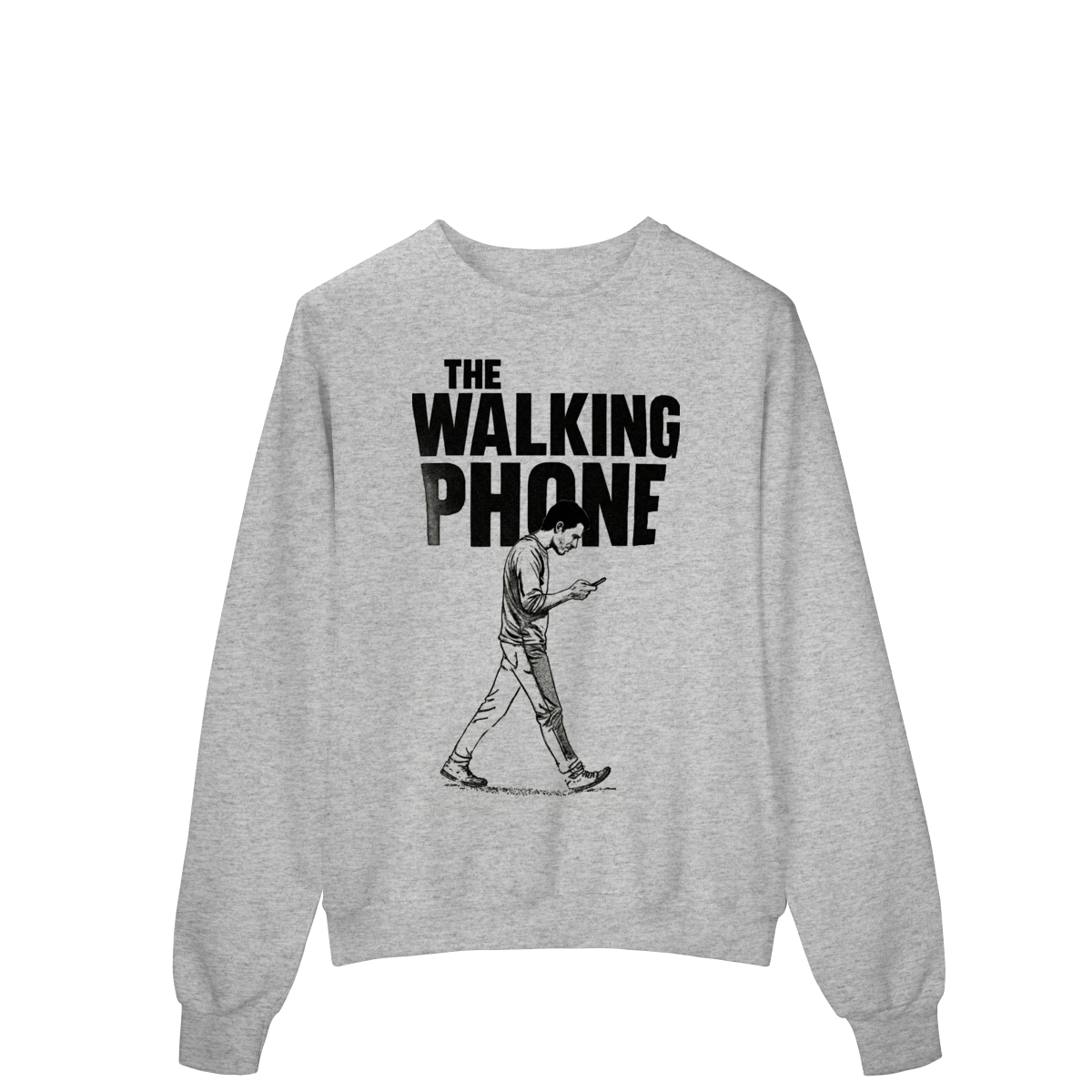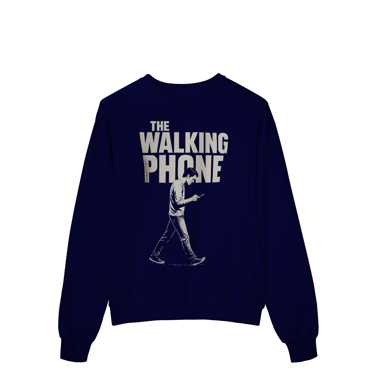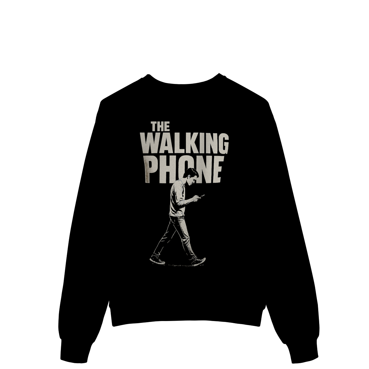 THE WALKING PHONE retrata o homem moderno andando no piloto automático, de cabeça baixa, guiado pela tela. Mais do que uma ironia visual, a estampa expõe um incômodo coletivo: uma sociedade viciada no celular. Esta peça comunica uma escolha clara — viver no real é melhor do que existir distraído.