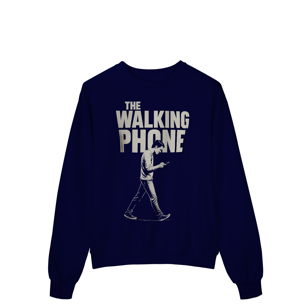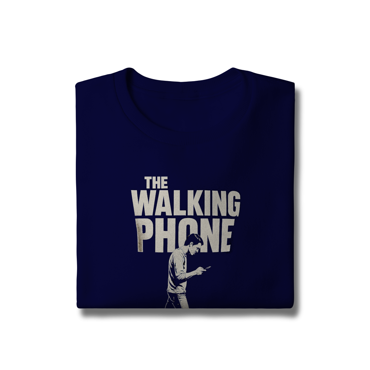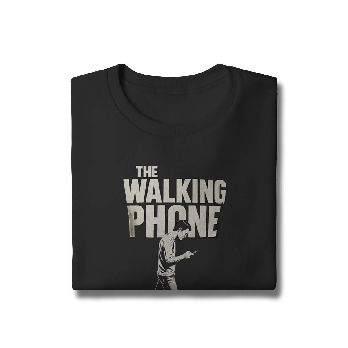 THE WALKING PHONE retrata o homem moderno andando no piloto automático, de cabeça baixa, guiado pela tela. Mais do que uma ironia visual, a estampa expõe um incômodo coletivo: uma sociedade viciada no celular. Esta peça comunica uma escolha clara — viver no real é melhor do que existir distraído.