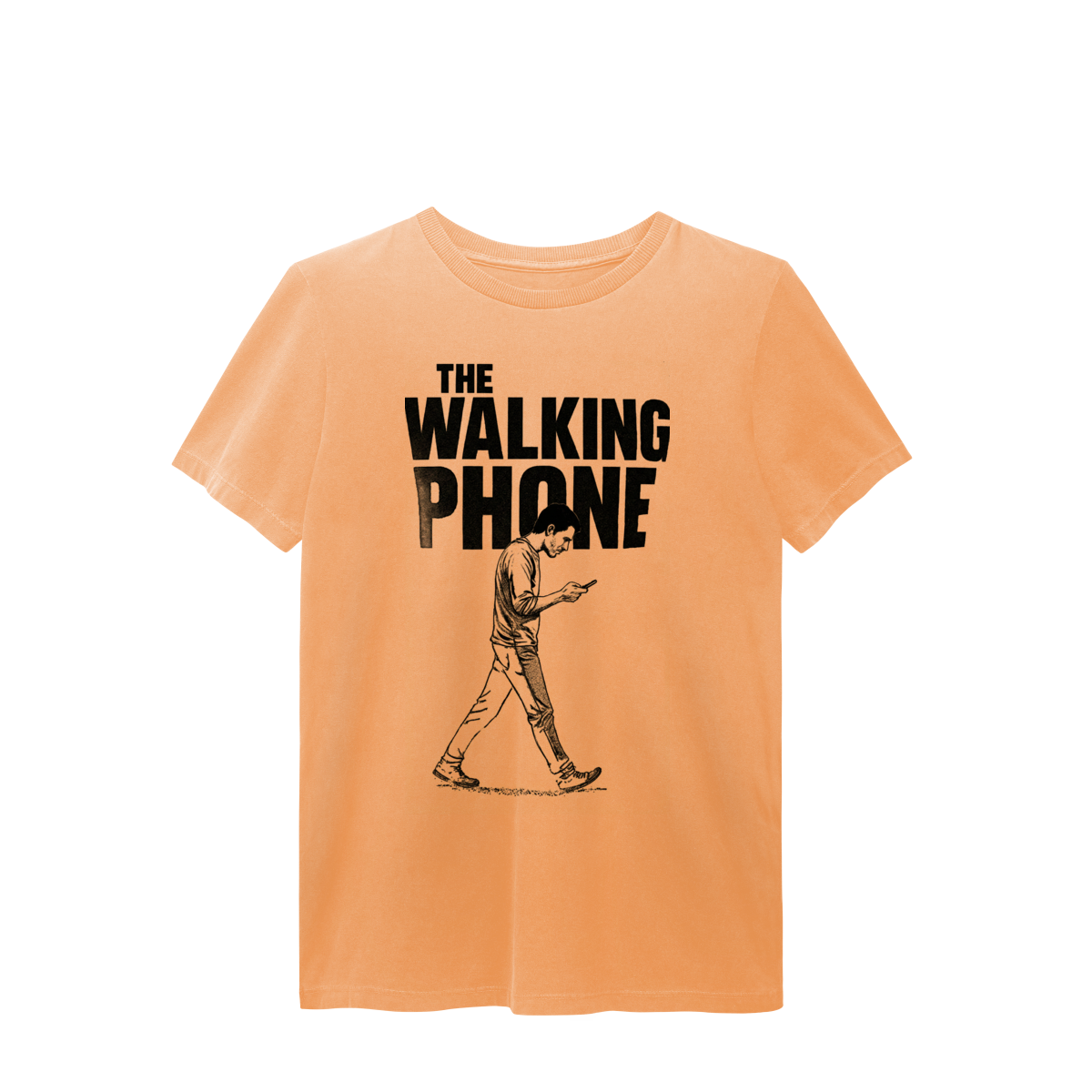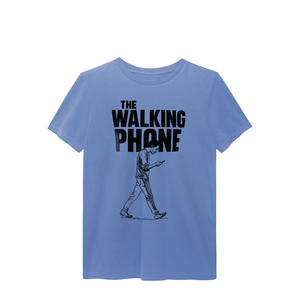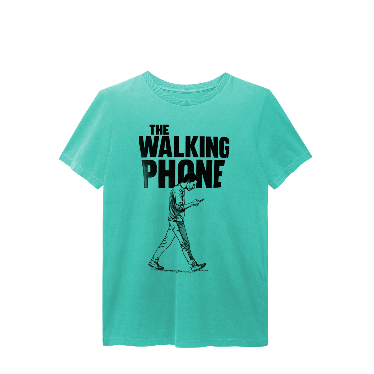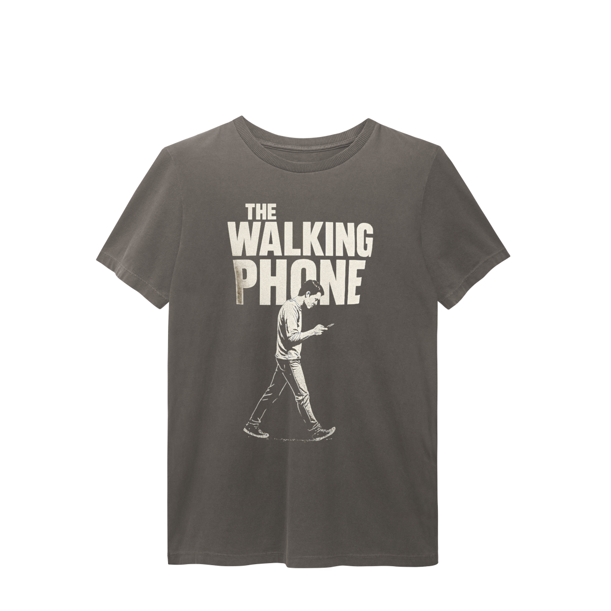 THE WALKING PHONE retrata o homem moderno andando no piloto automático, de cabeça baixa, guiado pela tela. Mais do que uma ironia visual, a estampa expõe um incômodo coletivo: uma sociedade viciada no celular. Esta peça comunica uma escolha clara — viver no real é melhor do que existir distraído.