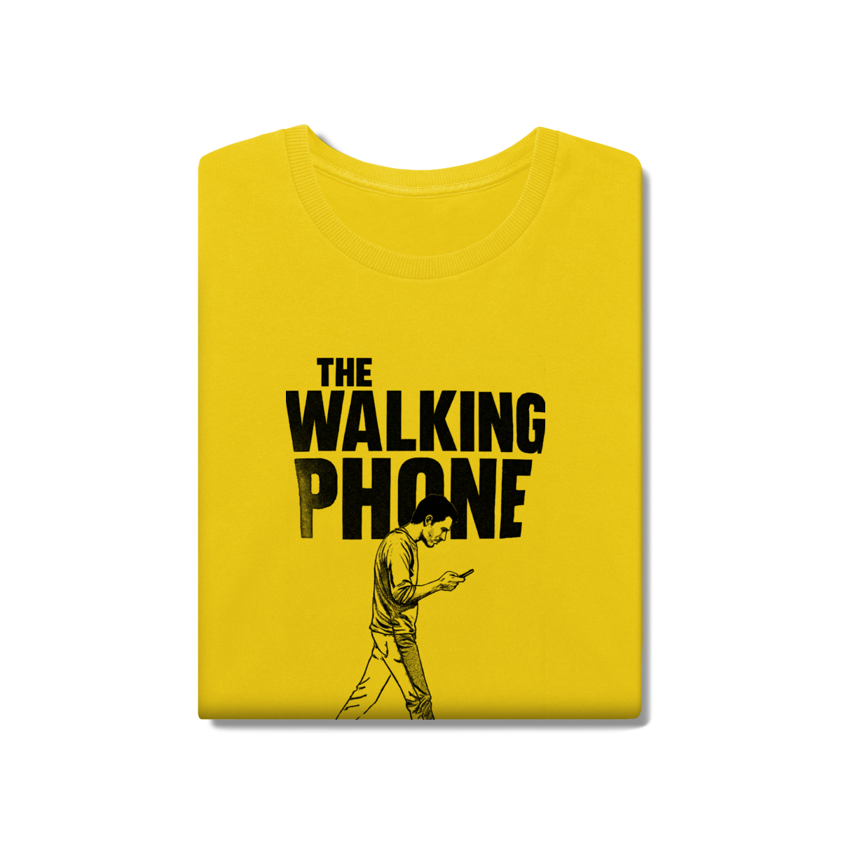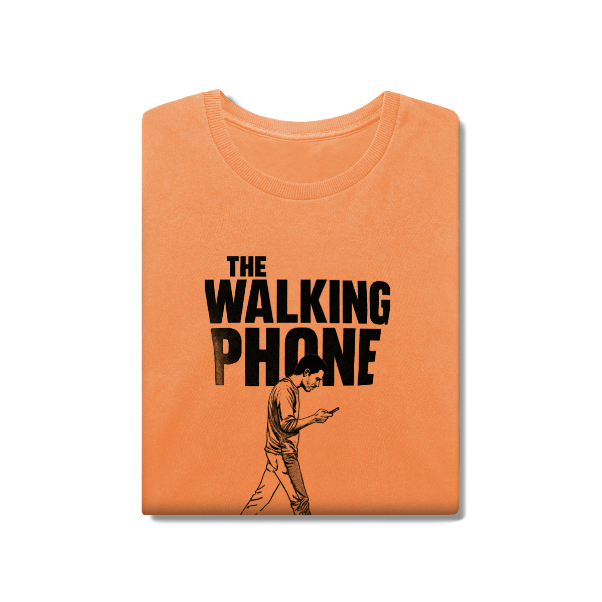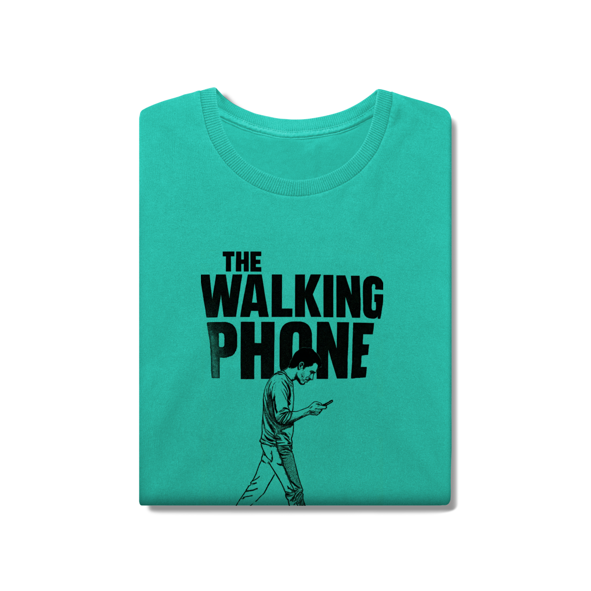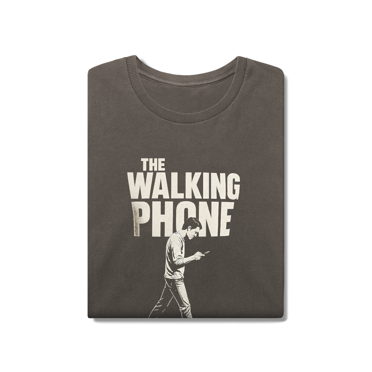THE WALKING PHONE retrata o homem moderno andando no piloto automático, de cabeça baixa, guiado pela tela. Mais do que uma ironia visual, a estampa expõe um incômodo coletivo: uma sociedade viciada no celular. Esta peça comunica uma escolha clara — viver no real é melhor do que existir distraído.