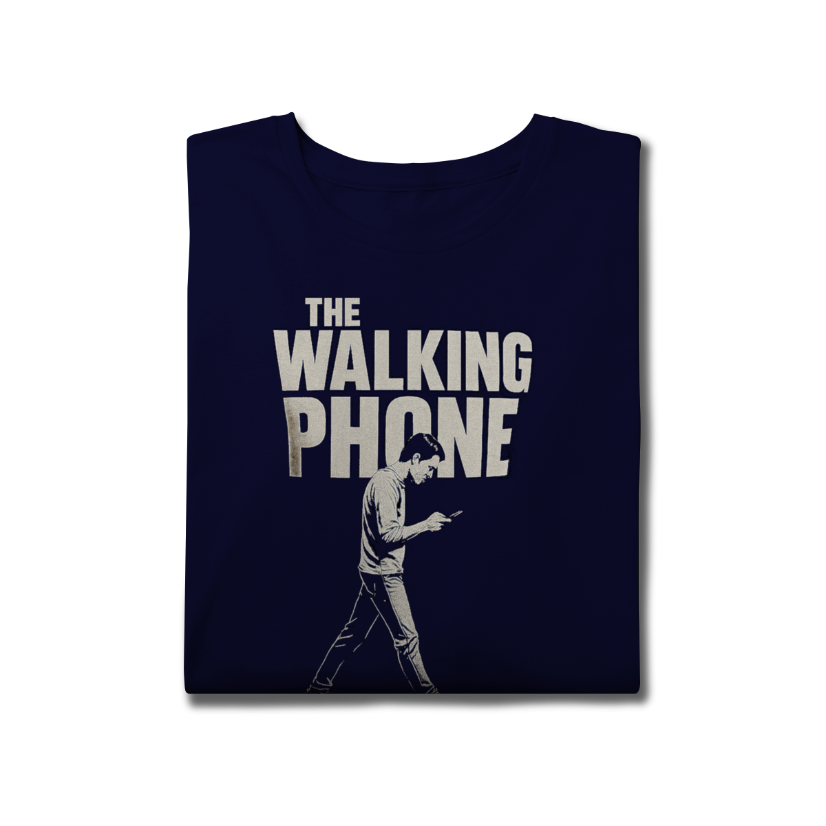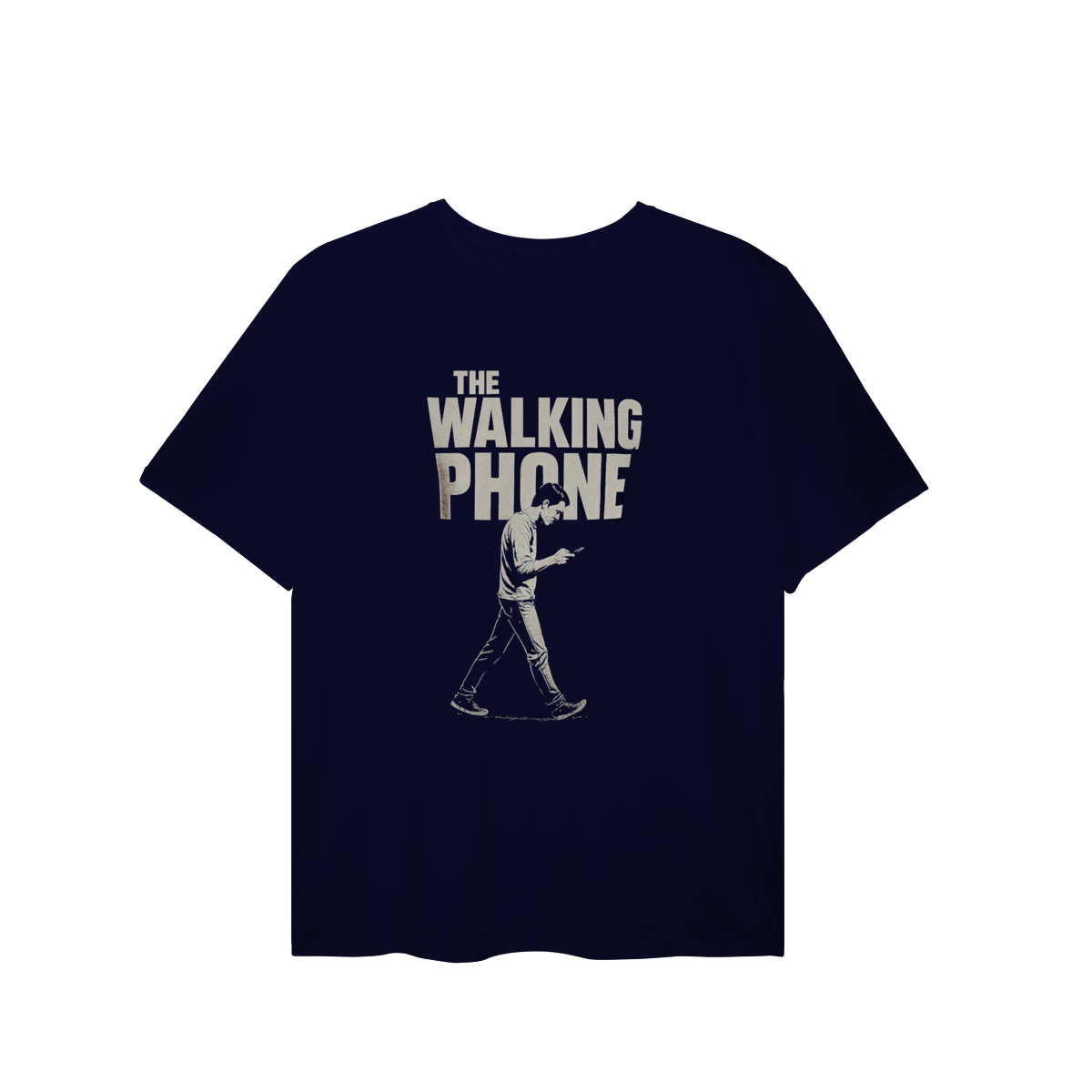 THE WALKING PHONE retrata o homem moderno andando no piloto automático, de cabeça baixa, guiado pela tela. Mais do que uma ironia visual, a estampa expõe um incômodo coletivo: uma sociedade viciada no celular. Esta peça comunica uma escolha clara — viver no real é melhor do que existir distraído.
